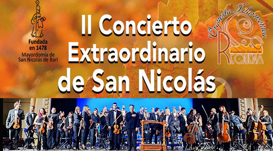 La Orquesta Filarmónica Fundación Ciudad de Requena ofrecerá un programa con obras de Wolfgang Amadeus Mozart y Georges Bizet en el Concierto Extraordinario de San Nicolás que tendrá lugar en el Teatro Principal de Requena el sábado 25 de octubre a las 19.30h. En el evento, organizado por la Mayordomía de San Nicolás de Bari, entidad fundada en 1478, con la colaboración de la Fundación Ciudad de Requena y de la concejalía de Cultura del Ayuntamiento de Requena, se galardonará a la Diputación de Valencia con la Medalla de Oro de la asociación.
