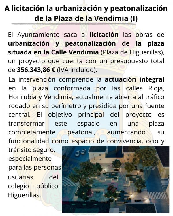 La intervención comprende la actuación integral en la plaza conformada por las calles Rioja, Honrubia y Vendimia, actualmente abierta al tráfico rodado y presidida por una fuente central. El objetivo principal es transformar este espacio en una plaza completamente peatonal, aumentando su funcionalidad como espacio de convivencia, ocio y tránsito seguro, especialmente para las personas usuarias del colegio público cercano.