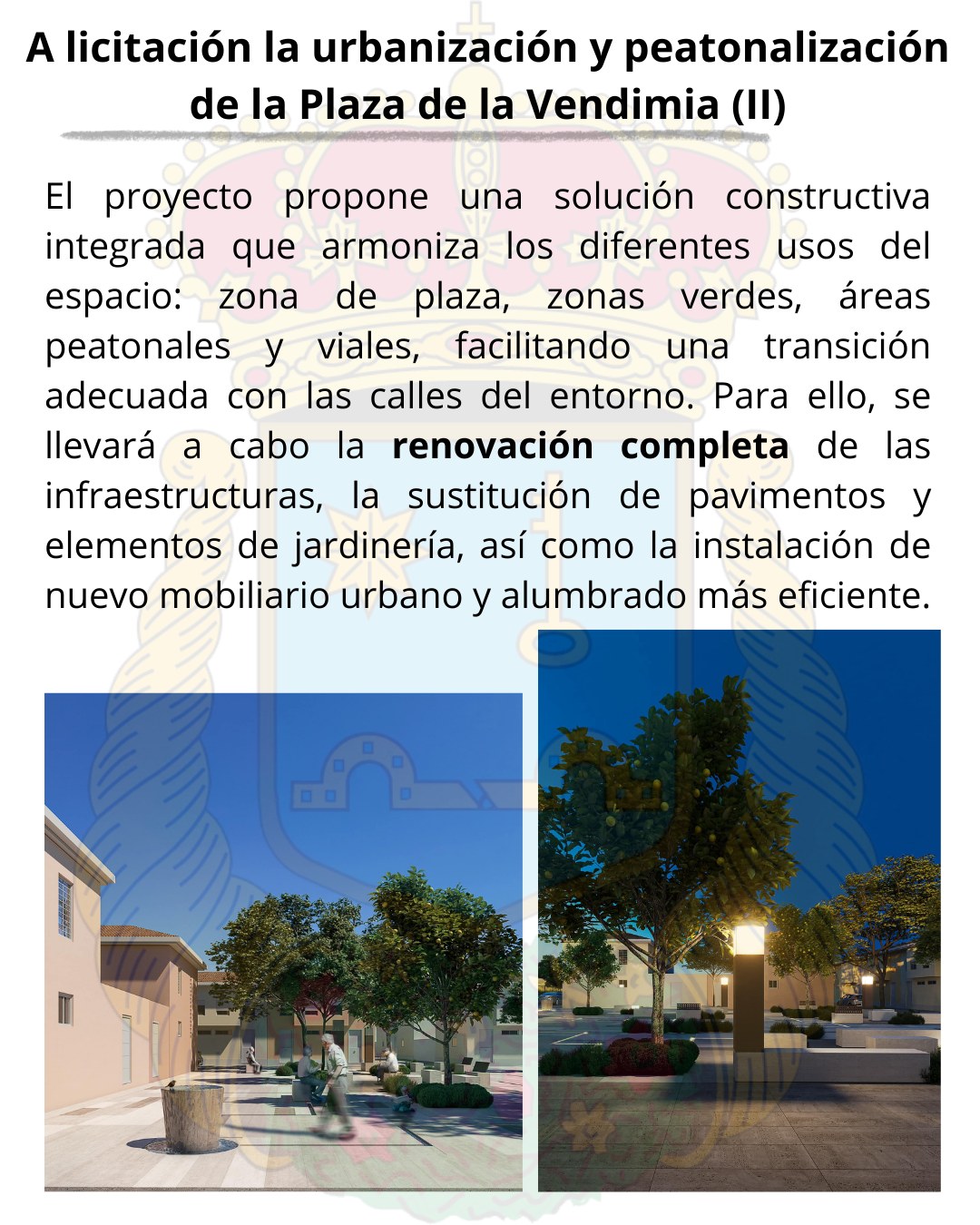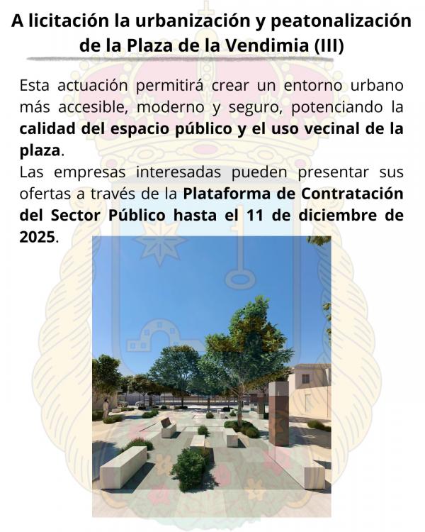 Desde el Ayuntamiento de Requena informan de que se ha iniciado el proceso de licitación de las obras de urbanización y peatonalización de la plaza pública situada en la Calle Vendimia s/n, un proyecto que cuenta con un presupuesto total de 356.343,86 euros (IVA incluido).