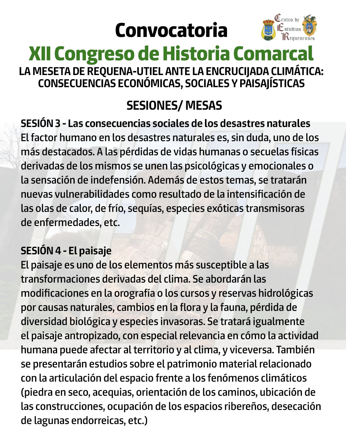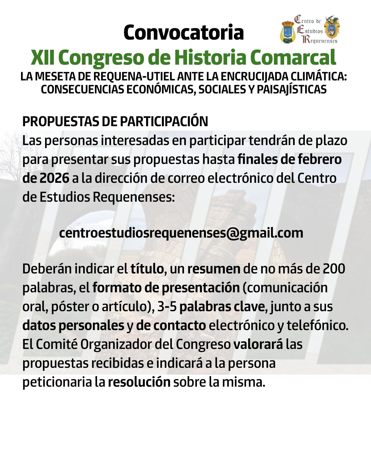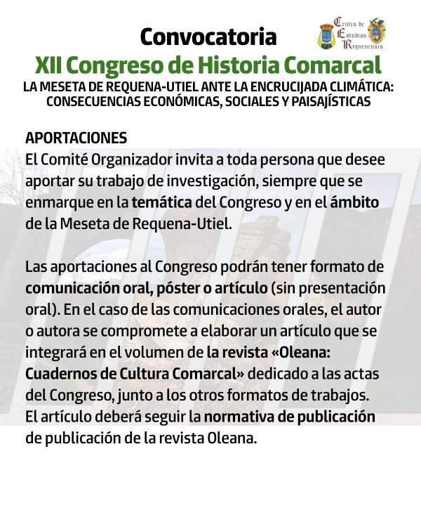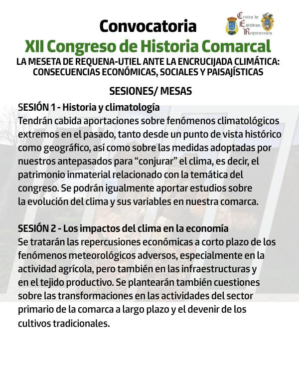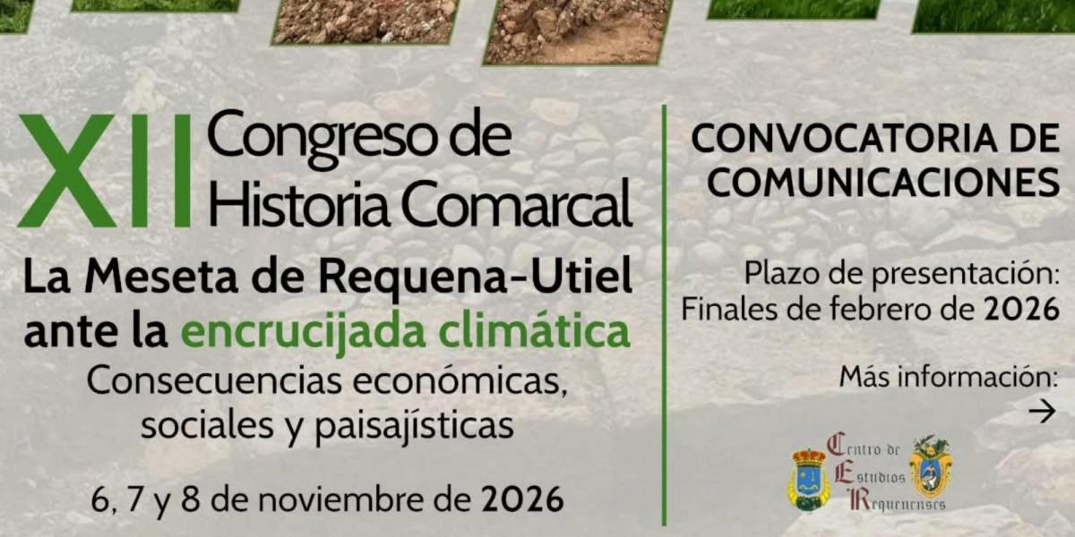 El Centro de Estudios Requenenses organiza el XII Congreso de Historia Comarcal bajo el lema «La Meseta de Requena-Utiel ante la encrucijada climática: consecuencias económicas, sociales y paisajísticas». Un evento para reflexionar sobre cómo los fenómenos climáticos han afectado, afectan y seguirán afectando a nuestra comarca desde una perspectiva multidisciplinar.