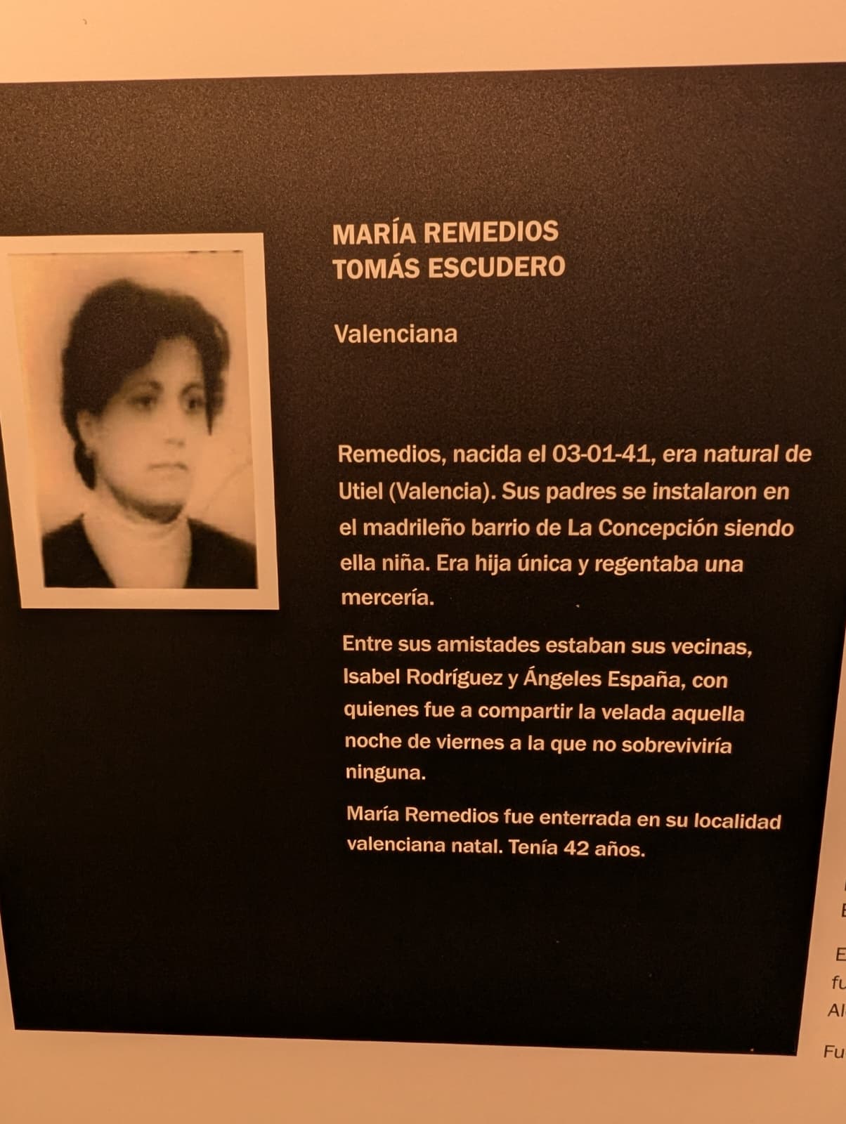 El atentado ocurrido en el Restaurante el Descanso el 12 de abril de 1985 segó la vida a 18 personas entre ellas una utielana, María Remedios Tomás Escudero, de 42 años de edad, la primera víctima valenciana asesinada por la yihad.