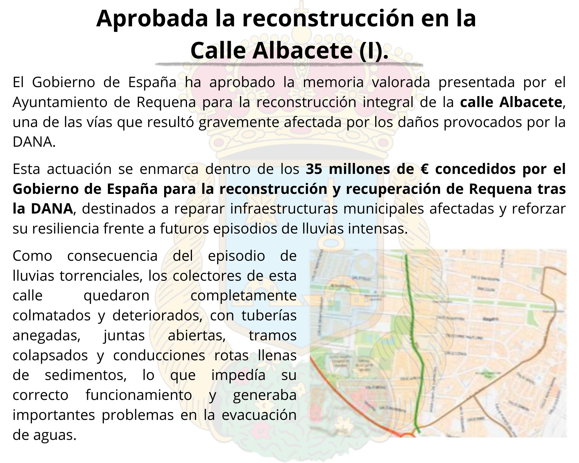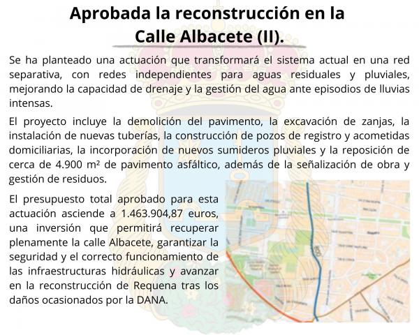 El Gobierno de España ha aprobado la memoria valorada, presentada por el Ayuntamiento de Requena, para la reconstrucción integral de la calle Albacete, una de las vías que resultó gravemente afectada por los daños provocados por la DANA.