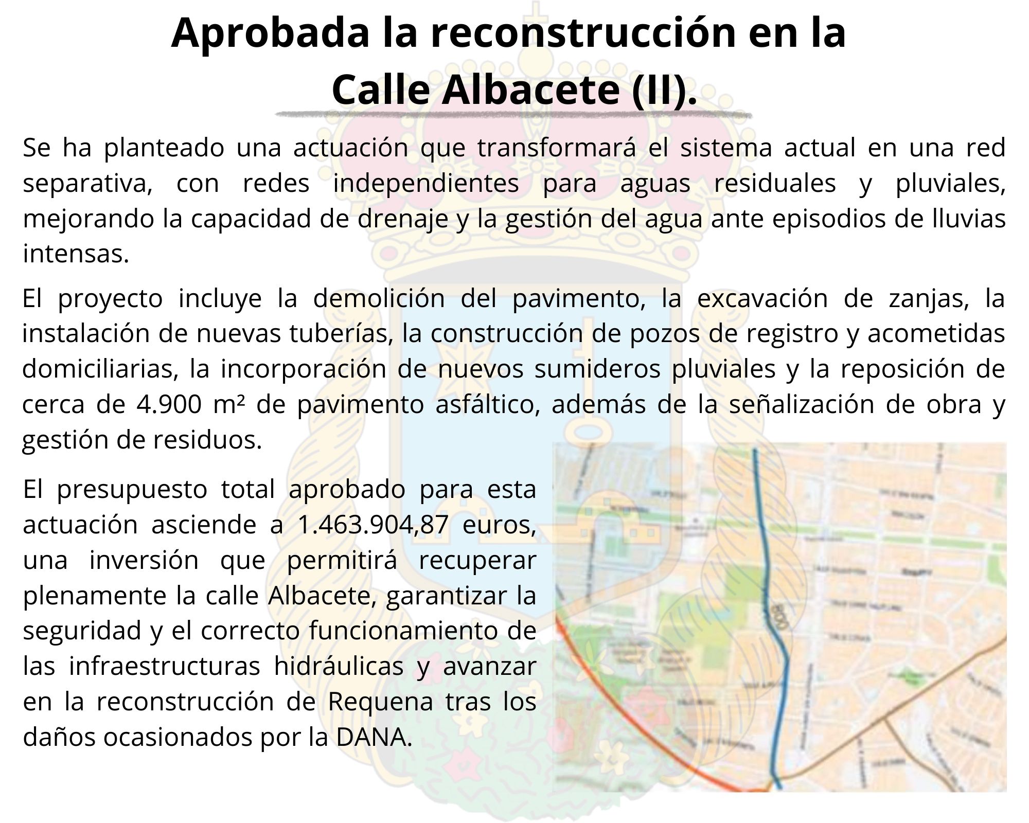 El presupuesto total aprobado para esta actuación asciende a 1.463.904,87 euros, una inversión que permitirá recuperar plenamente la calle Albacete, garantizar la seguridad y el correcto funcionamiento de las infraestructuras hidráulicas y avanzar en la reconstrucción de Requena tras los daños ocasionados por la DANA.