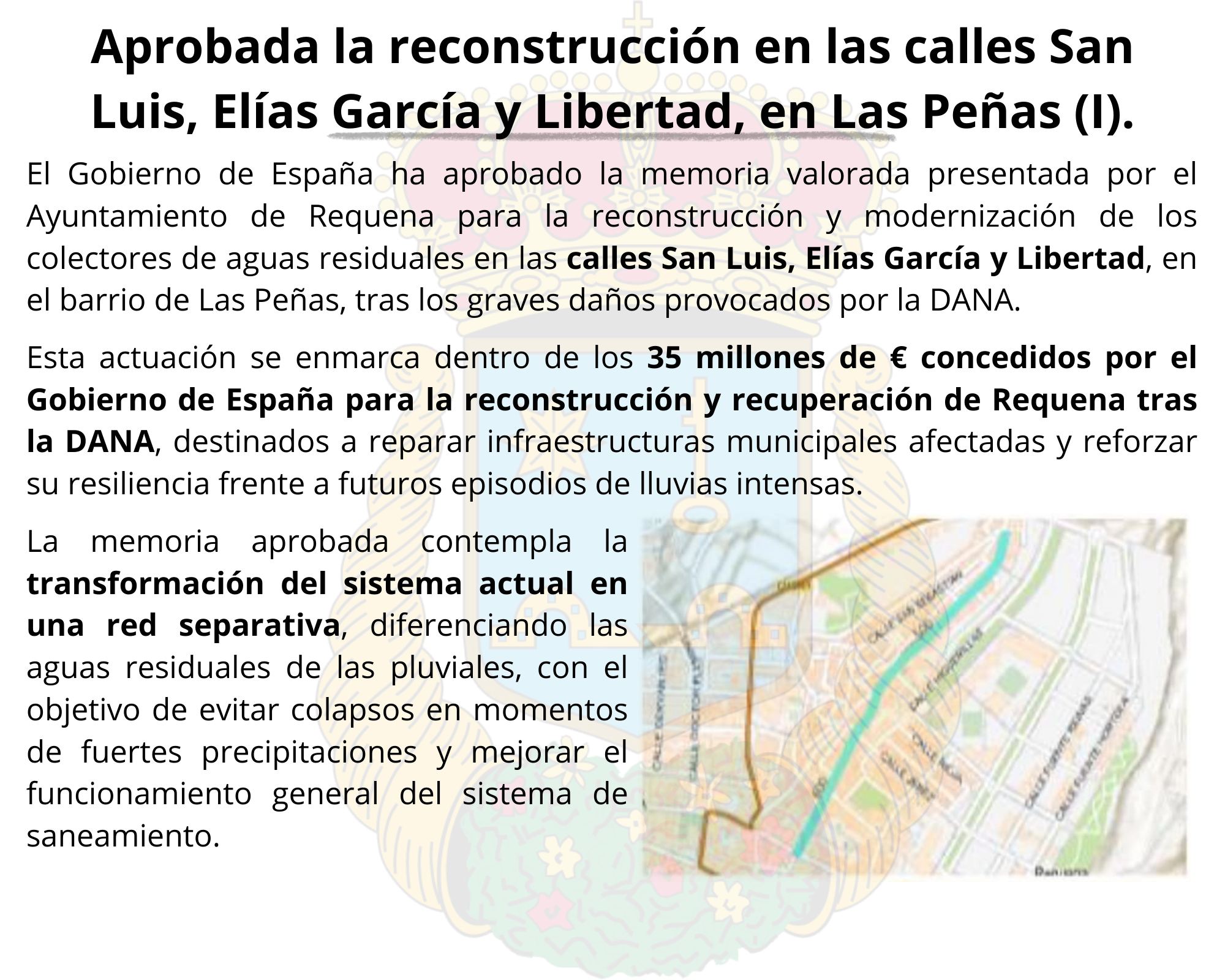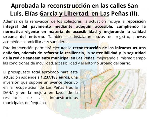El Gobierno de España ha aprobado la memoria valorada presentada por el Ayuntamiento de Requena para la reconstrucción y modernización de los colectores de aguas residuales en las calles San Luis, Elías García y Libertad, en el barrio de Las Peñas, tras los graves daños provocados por la DANA.