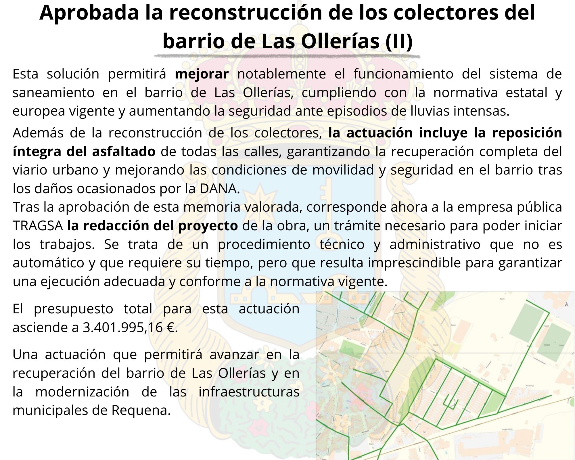 El presupuesto total aprobado para esta actuación asciende a 3.401.995,16 €, una inversión que permitirá avanzar de forma decisiva en la recuperación del barrio de Las Ollerías y en la modernización de las infraestructuras municipales de Requena.