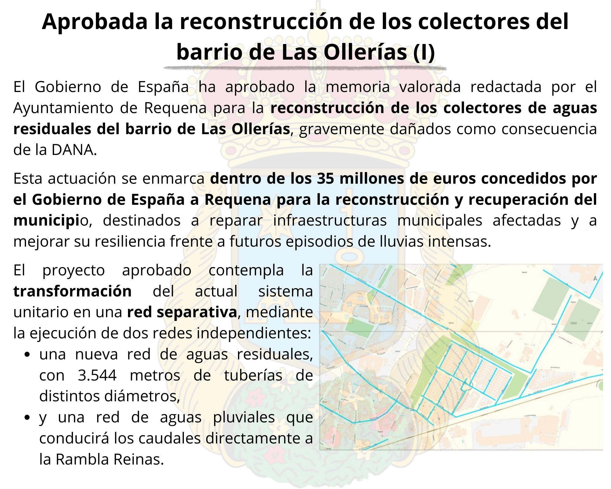 Esta actuación se enmarca dentro de los 35 millones de euros concedidos por el Gobierno de España a Requena para la reconstrucción y recuperación del municipio, destinados a reparar infraestructuras municipales afectadas y a mejorar su resiliencia frente a futuros episodios de lluvias intensas.