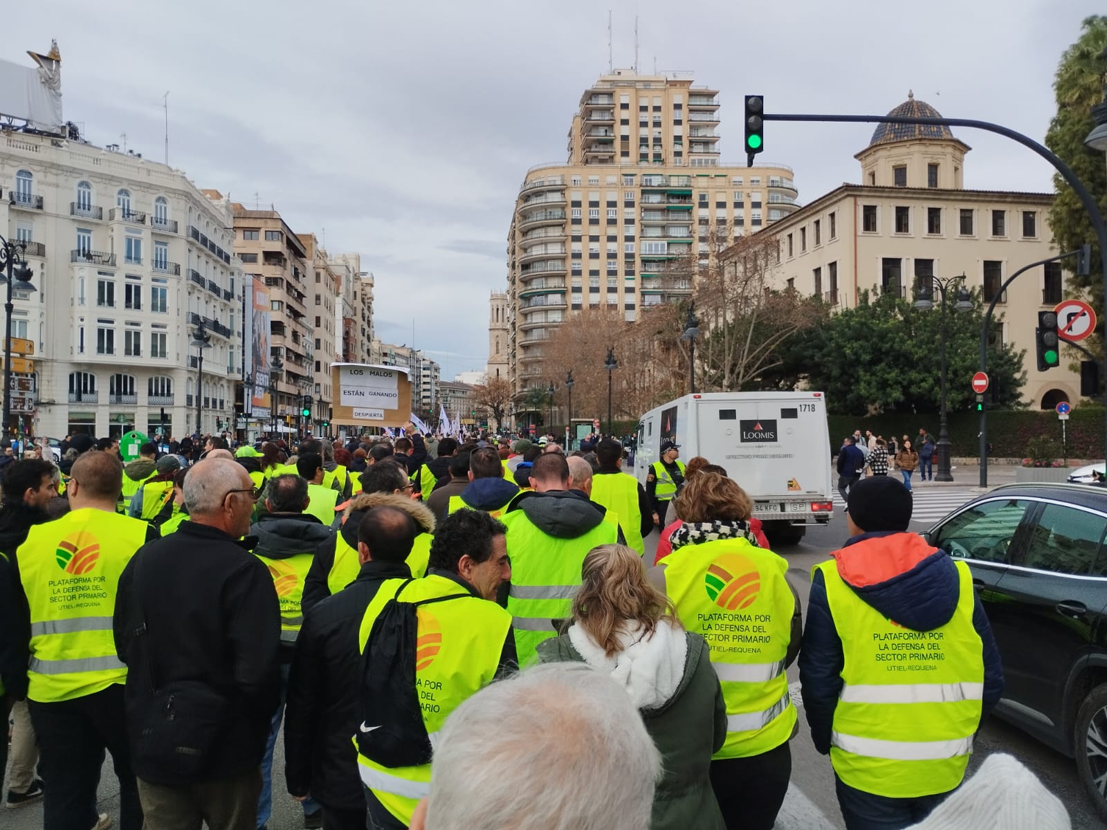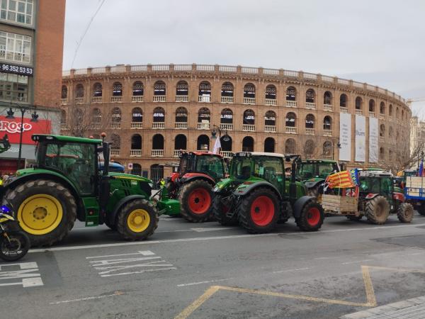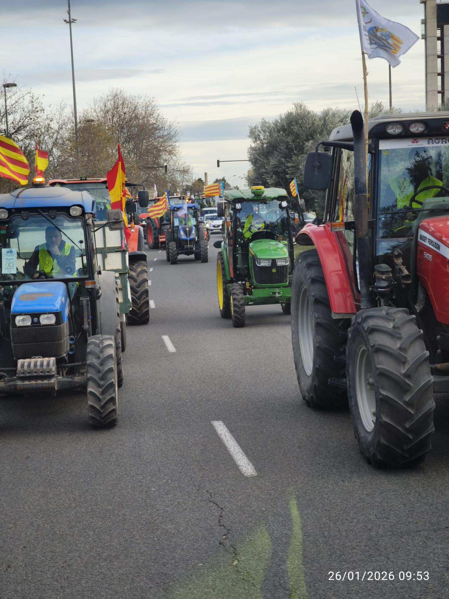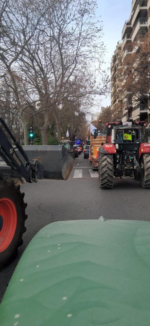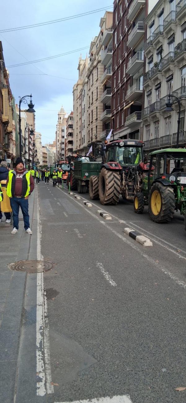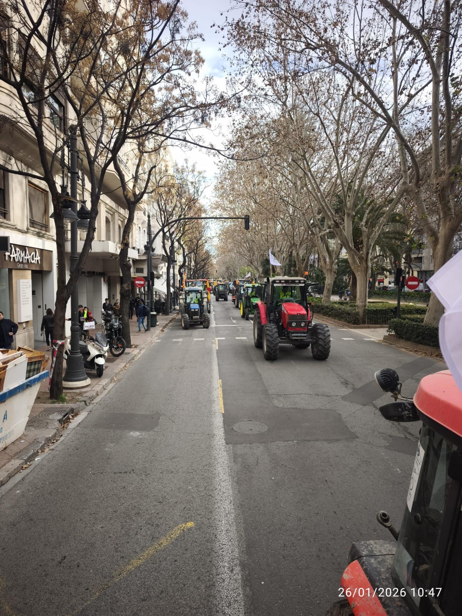 El lunes, a las 8.30 horas, desde Burjassot, salimos los tractores en dirección a Valencia pasando por la Ronda Norte, Avenida Cataluña, Av. Aragón, Gran Vía Marqués del Turia, para reunirnos frente a la Estación del Norte con otros agricultores y tractores provenientes de Villareal, Alcira, Sueca, Sollana, etc…