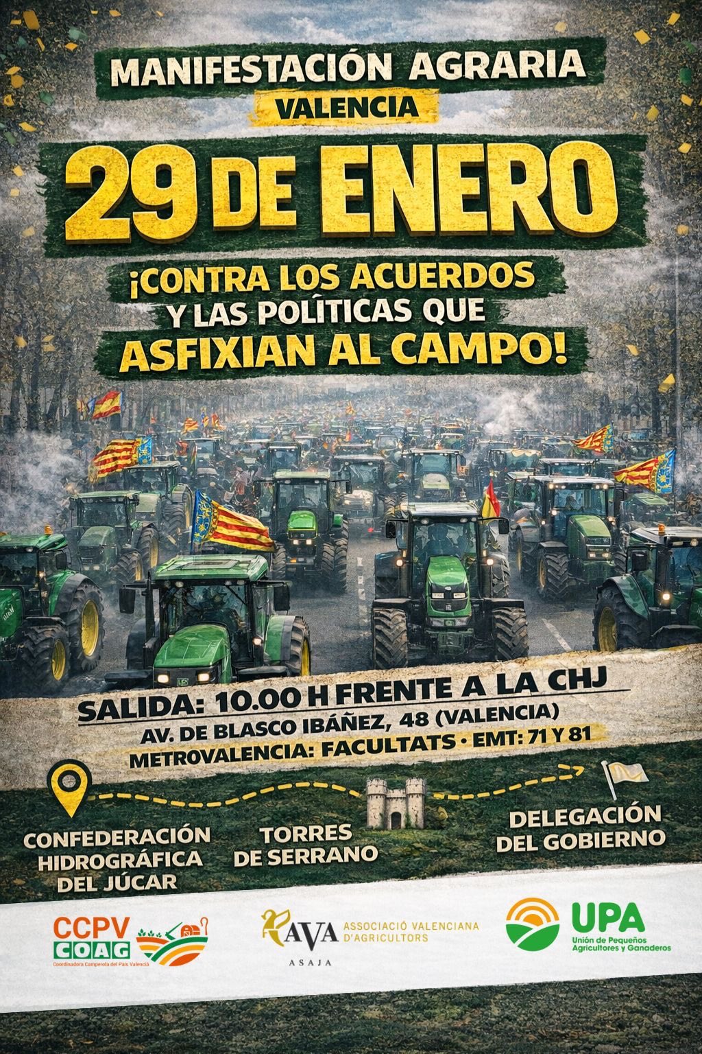 ASAJA, COAG y UPA mantienen la convocatoria conjunta de más movilizaciones entre el 26 y el 30 de enero, que tendrán el 29 de enero como ‘superjueves’, para seguir metiendo presión a los representantes políticos. Así, AVA-ASAJA participará en una gran manifestación en Valencia el próximo jueves 29 de enero, a la que están invitados tanto productores como consumidores y entidades de la sociedad civil.