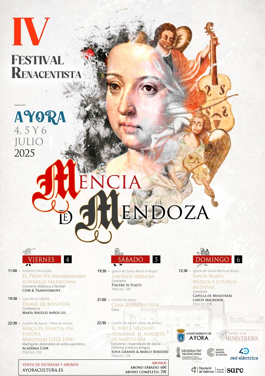 Del 4 al 6 de julio de 2025 Ayora celebra el IV Festival Renacentista Mencía de Mendoza. Durante estos días podremos disfrutar de conferencias, visitas y conciertos de música renacentista dentro de un marco incomparable como es el Castillo de Ayora o la iglesia de Santa María la Mayor.