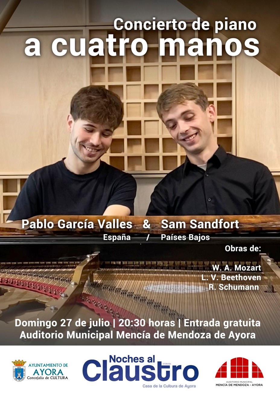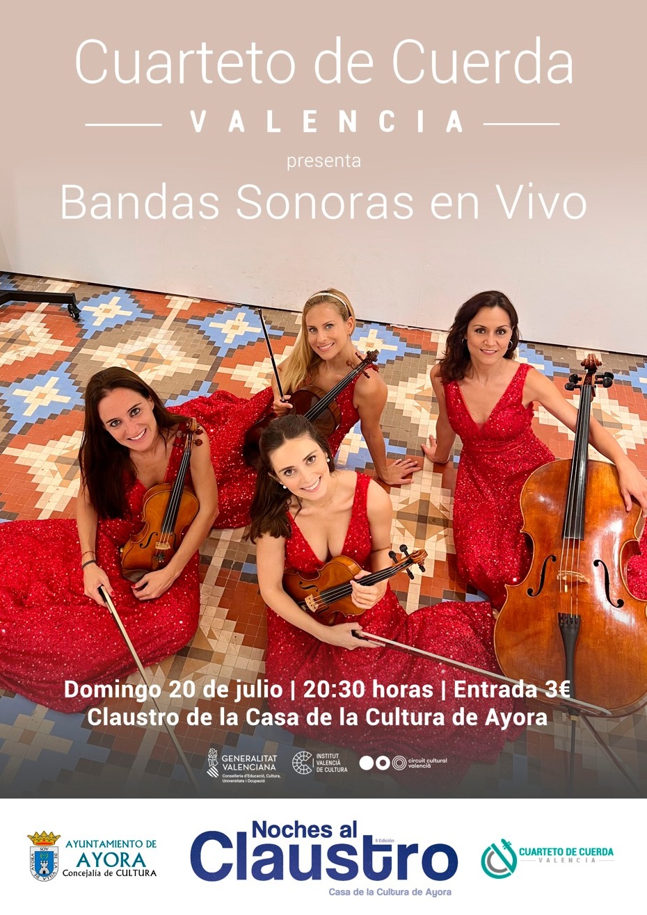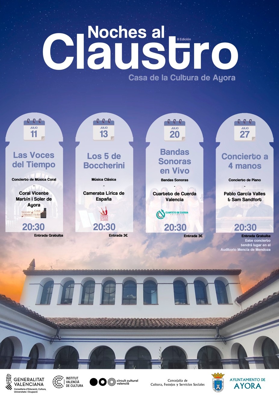 A través de este formato podremos deleitarnos con diferentes conciertos que se llevarán a cabo los fines de semana de julio y que nos permitirán disfrutar de la música en un entorno único como es el claustro de la Casa de la Cultura de Ayora, salvo el concierto del día 27 que se celebrará en el auditorio municipal Mencía de Mendoza.
