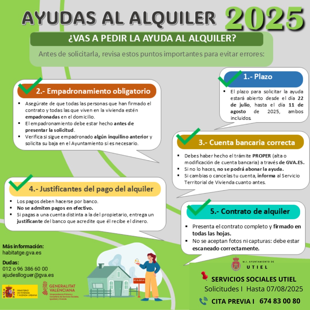 El Ayuntamiento de Utiel ha habilitado la tramitación de las ayudas al alquiler de viviendas correspondientes al Plan estatal para el acceso a la vivienda 2022-2025 tras la publicación ayer en el DOGV de esta convocatoria de 2025