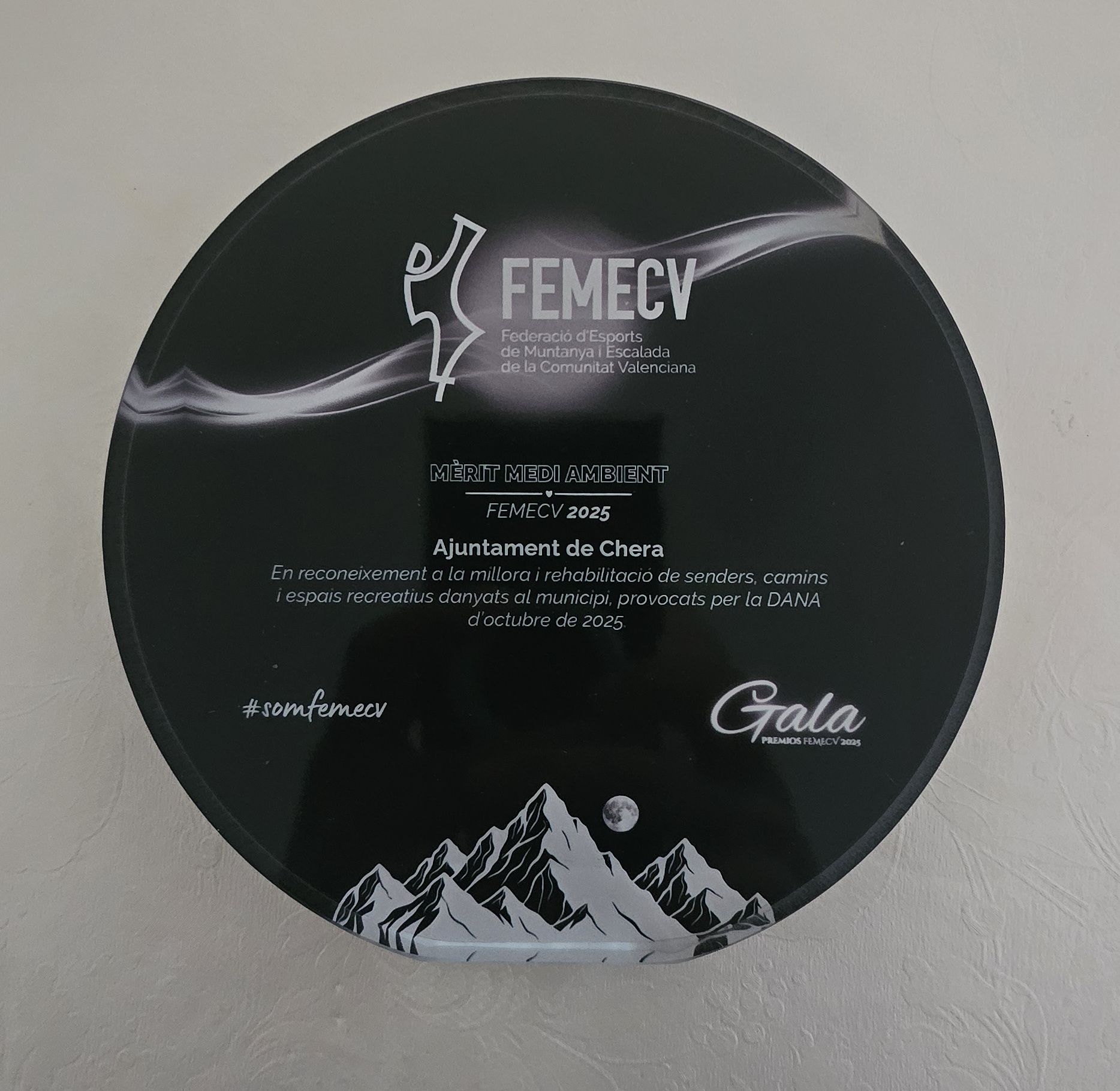 El segundo reconocimiento ha sido concedido por la Federación de Montaña y Escalada de la Comunidad Valenciana, en agradecimiento a los trabajos de rehabilitación de espacios públicos realizados tras la DANA, actuaciones que han permitido recuperar zonas afectadas y garantizar nuevamente su seguridad y funcionalidad.