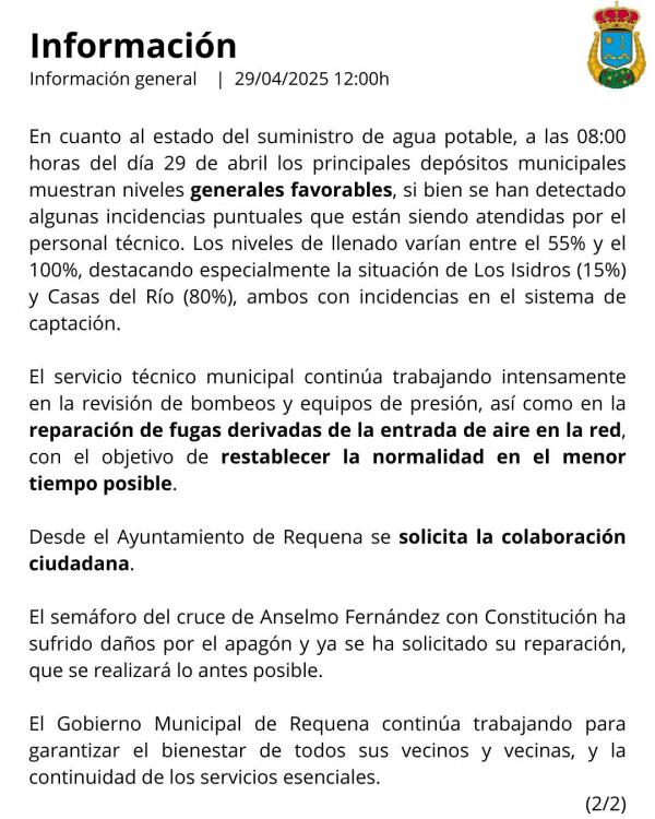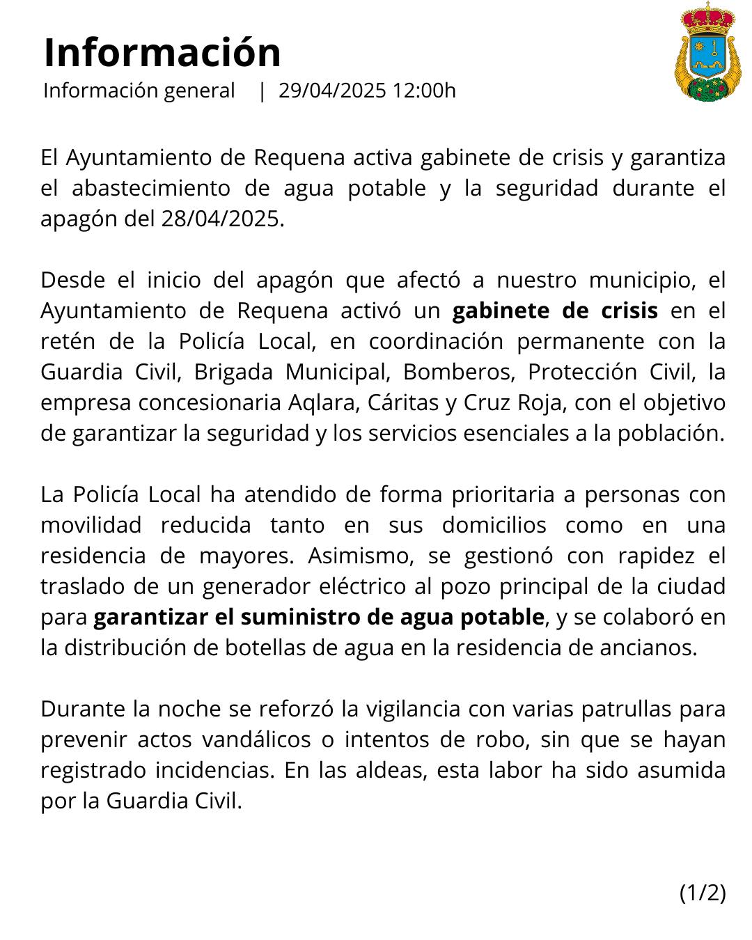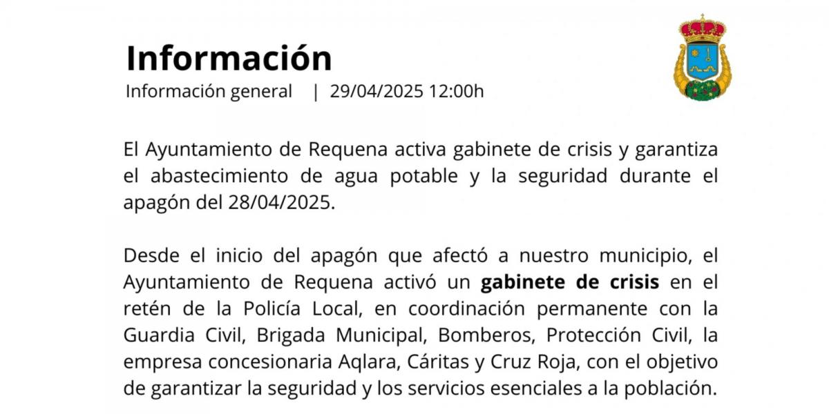 El Ayuntamiento de Requena activa gabinete de crisis durante el apagón del 28/04/2025.