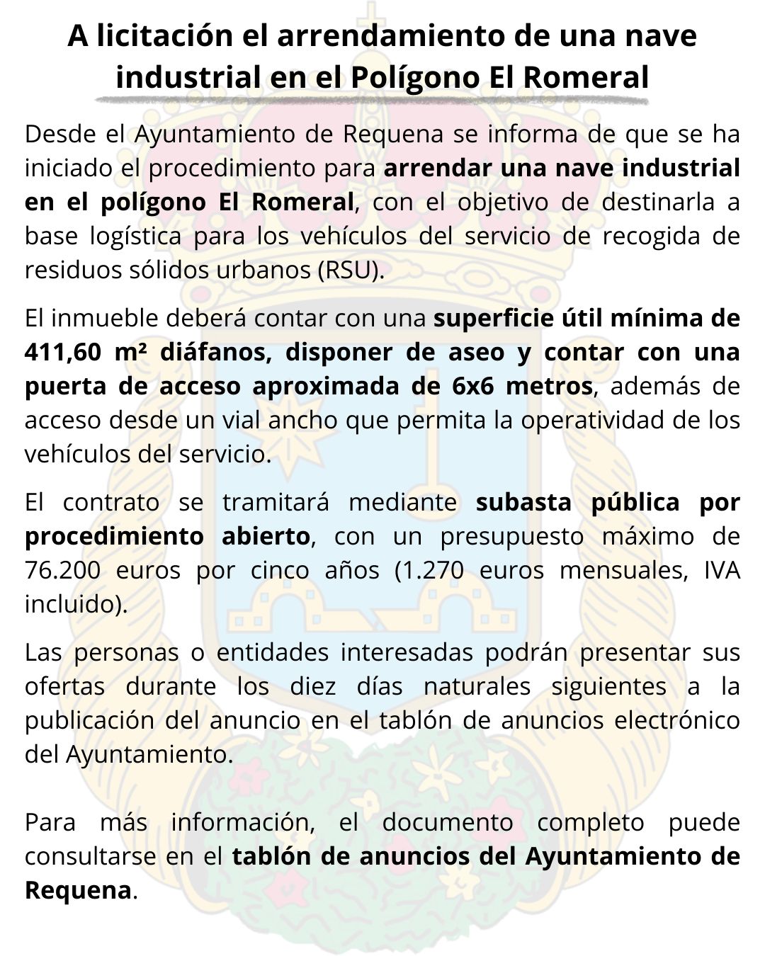 Desde el Ayuntamiento de Requena informan de que se ha iniciado el procedimiento para arrendar una nave industrial en el polígono El Romeral, con el objetivo de destinarla a base logística para los vehículos del servicio de recogida de residuos sólidos urbanos (RSU).