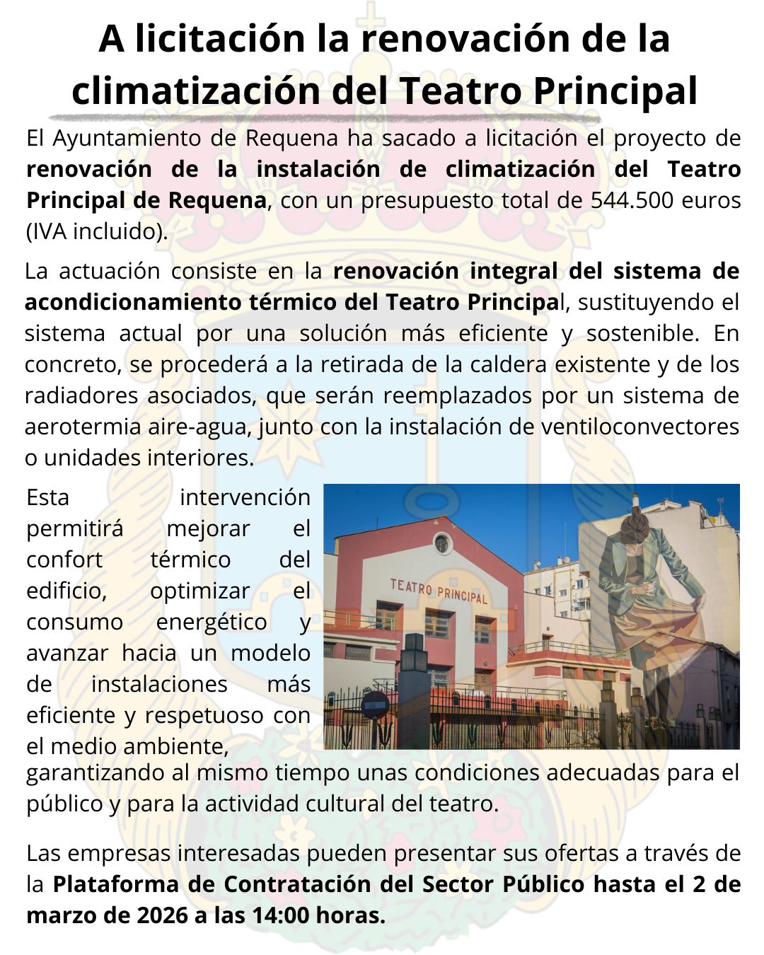 Desde el Ayuntamiento de Requena se ha sacado a licitación el proyecto de renovación de la instalación de climatización del Teatro Principal de Requena, con un presupuesto total de 544.500 euros (IVA incluido).