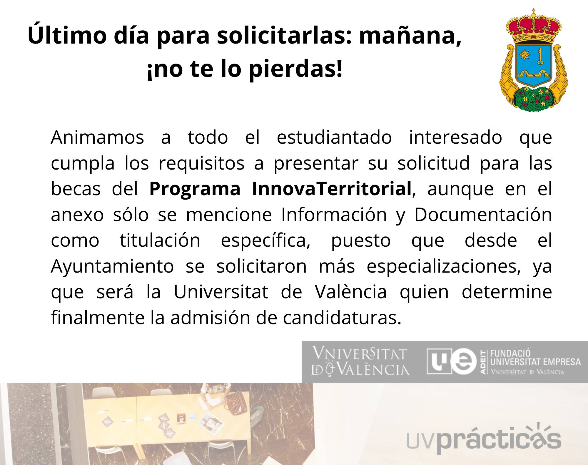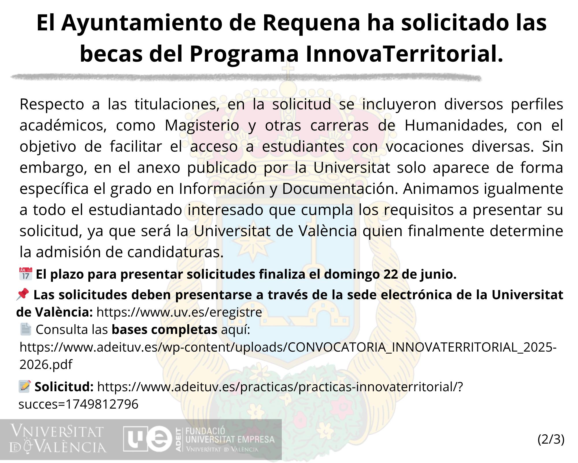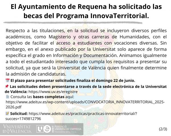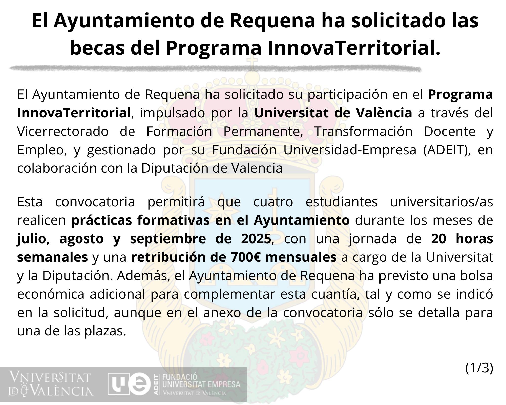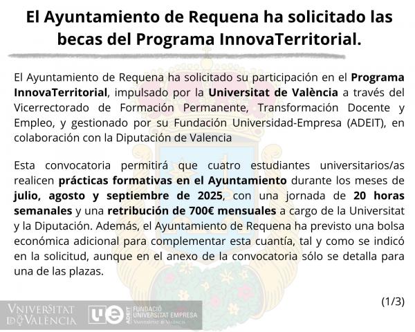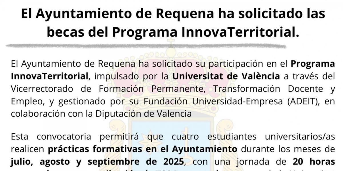 El Ayuntamiento de Requena ha solicitado su participación en el Programa InnovaTerritorial, impulsado por la Universitat de València a través del Vicerrectorado de Formación Permanente, Transformación Docente y Empleo, y gestionado por su Fundación Universidad-Empresa (ADEIT), en colaboración con la Diputación de Valencia.