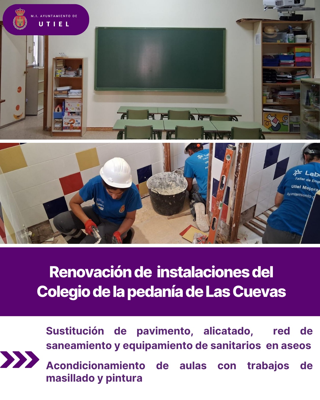 Desde el Taller de Empleo “Utiel Mejora V” están llevando a cabo la renovación de estas instalaciones a las que se sumarán otras intervenciones que mejorarán considerablemente esta infraestructura educativa y los servicios que ofrece a más de una treintena de alumnos y alumnas del aulario de Las Cuevas integrado en el CRA Oleana.