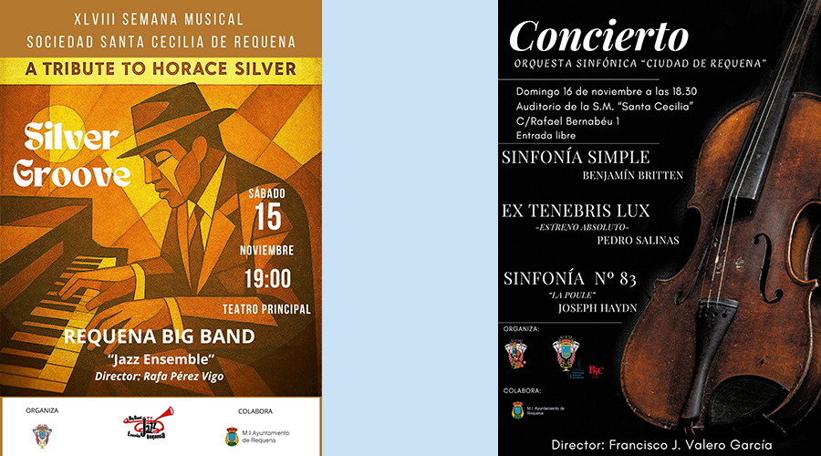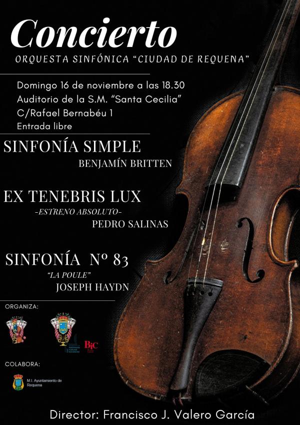 Por la tarde, a las 18.30 en el Auditorio de la Sociedad Musical Santa Cecilia, será la Orquesta Sinfónica «Ciudad de Requena» dirigida por Francisco J. Valero la que ofrecerá un concierto en el que interpretará la «Sinfonía Simple» de B. Britten y la Sinfonía nº 83 «La Poule» de J. Haydn. Además, la Orquesta Sinfónica, interpretará como estreno absoluto, la obra «Ex Tenebris Lux» del compositor requenense Pedro Salinas, obra galardonada con la mención honorífica del International Composition Prize de Sacile (Italia).