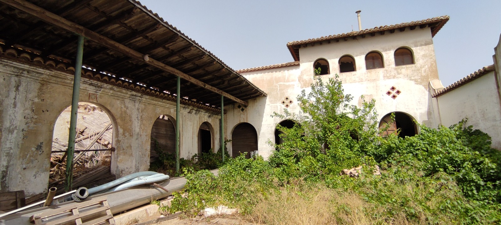 El edificio se articula alrededor de un patio central empedrado. A este se accedía a través de dos torres que flanquean la entrada, ubicadas en las esquinas de las fachadas, utilizada como despacho la torre izquierda y como laboratorio la derecha. Estas torres cierran el patio mediante una tapia con albardilla de teja, es decir, un remate en tejadillo que protege el muro de las inclemencias meteorológicas. El acceso al patio lo conforma una gran puerta carretera, sobre la cual se encuentra un frontal con una cenefa labrada en yeso donde esta inscrito “Bodega de Luis Mompó”. Estas serían las instalaciones de vinificación, la “bodega-cocedero”, donde se transformaba la uva en vino.