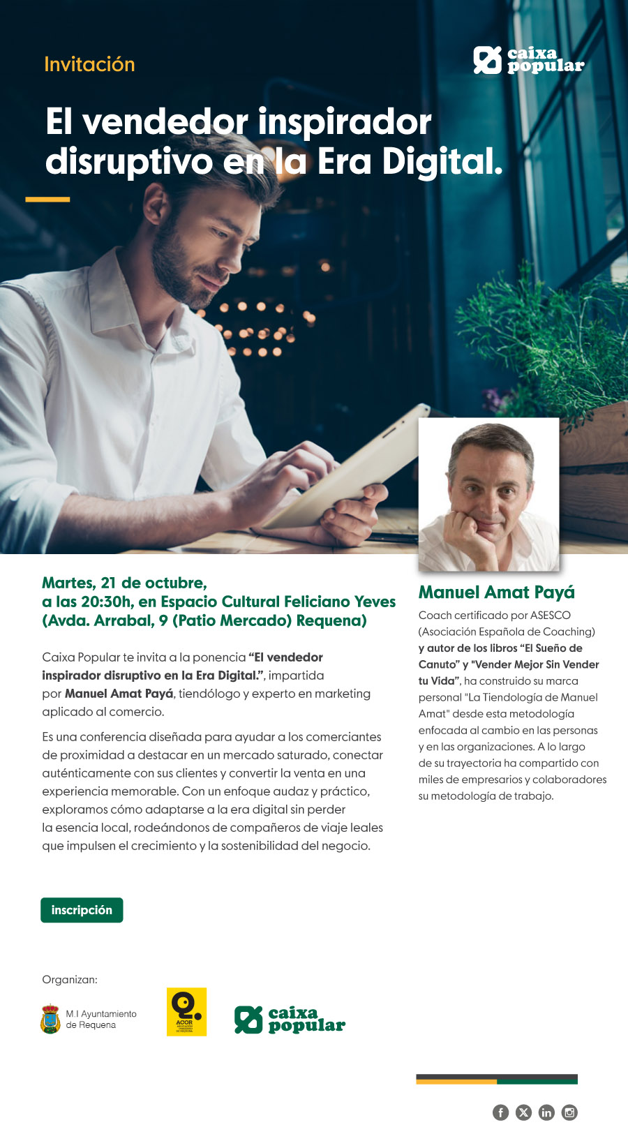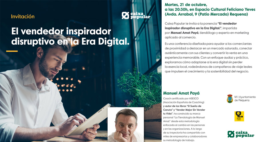 Caixa Popular, en colaboración con el Ayuntamiento de Requena, ha organizado una ponencia dirigida al tejido comercial local bajo el título “El vendedor inspirador disruptivo en la Era Digital”, que tendrá lugar el próximo martes 21 de octubre a las 20:30h en el Espacio Cultural Feliciano Yeves.