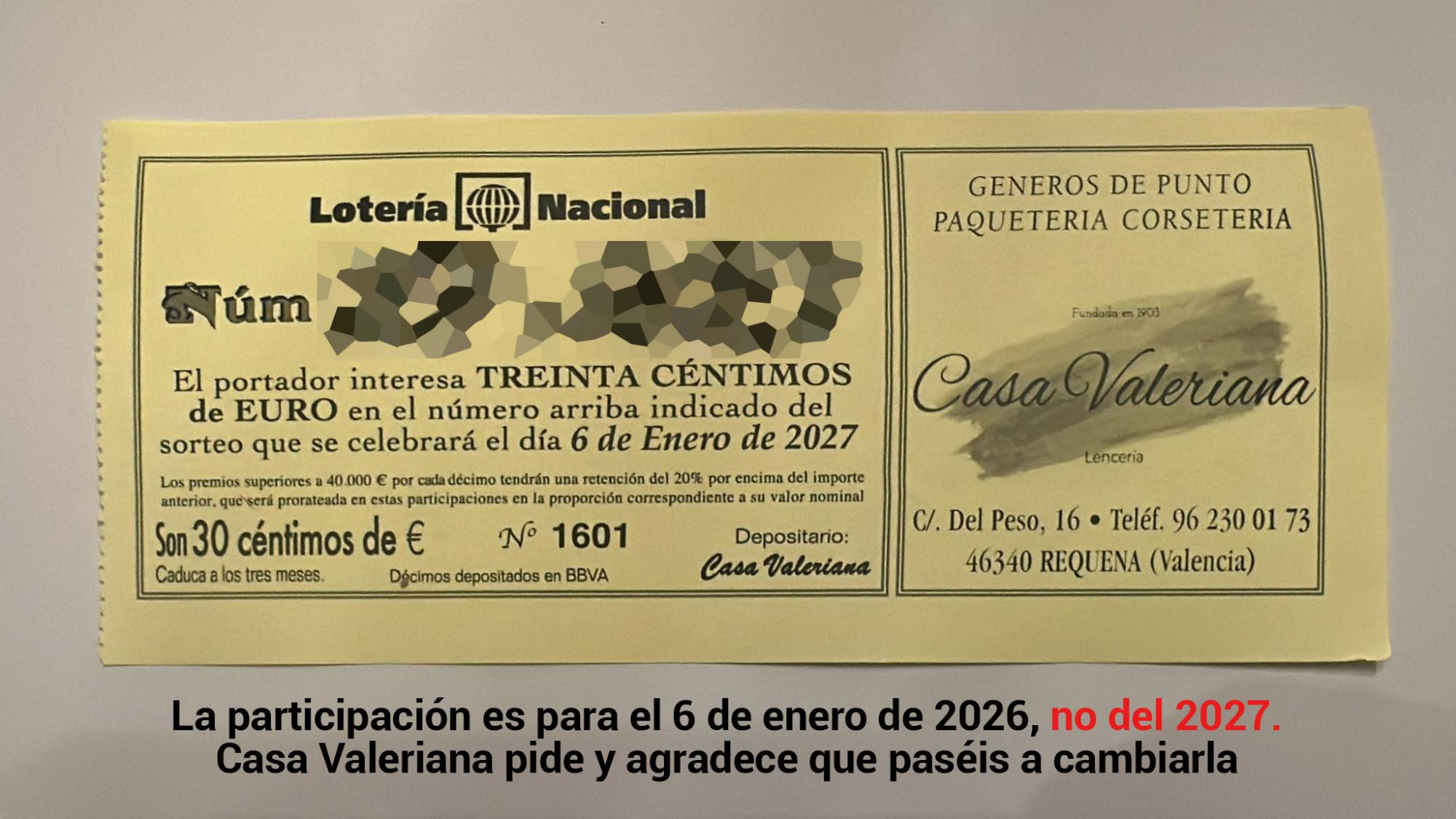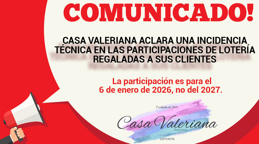 El comercio Casa Valeriana informa de que ha detectado un error de imprenta en las participaciones de lotería con las que ha venido obsequiando a sus clientes, con motivo de las compras realizadas, hasta el pasado 30 de diciembre de 2025.