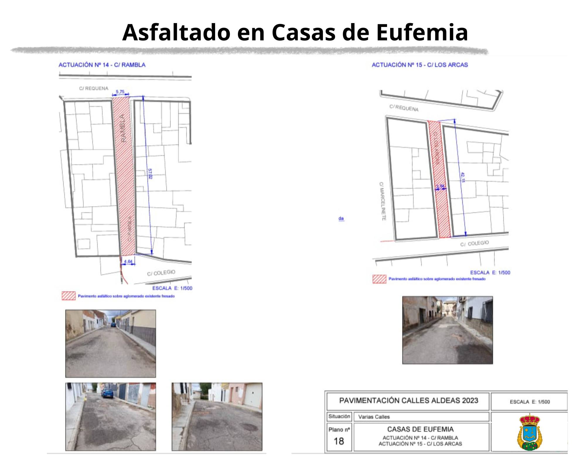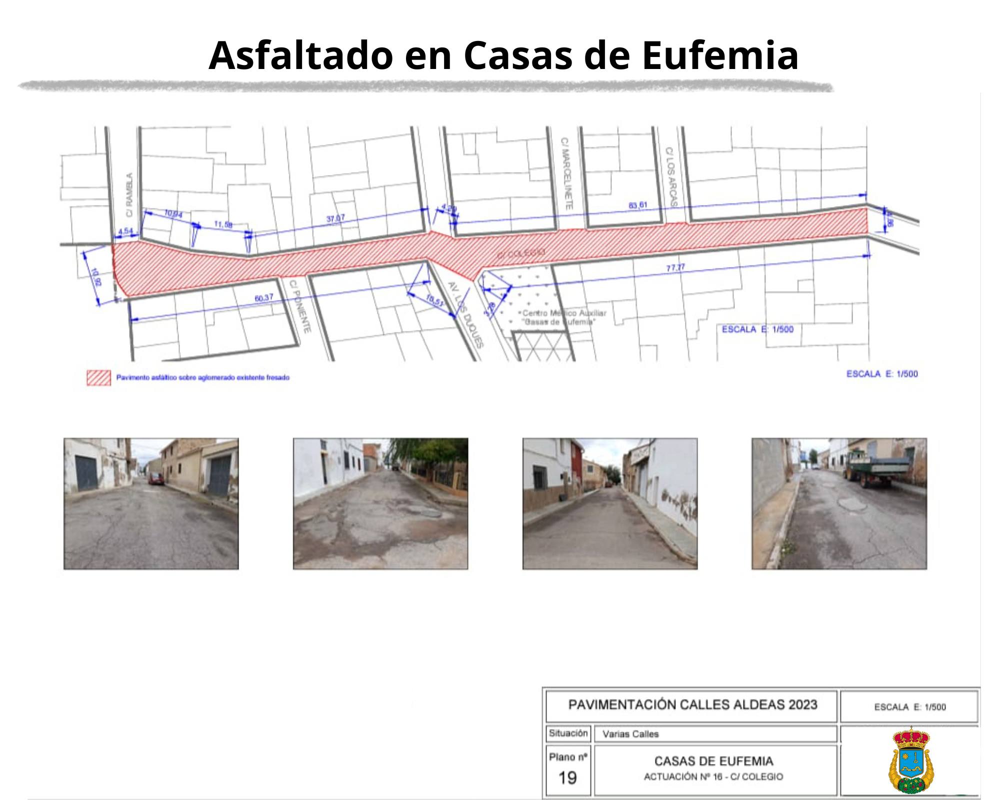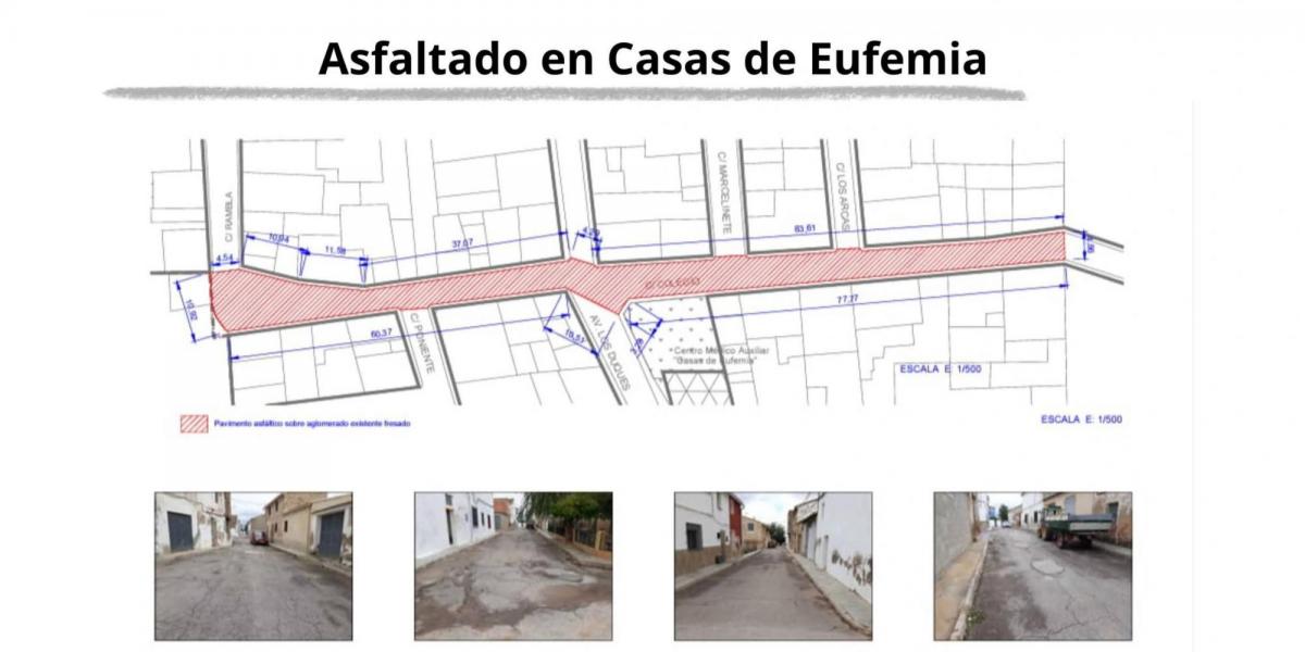 Desde el Ayuntamiento de Requena, hemos puesto en marcha el primer plan de asfaltado en aldeas , un proyecto que contempla intervenciones importantes para mejorar el entorno urbano de varias pedanías del municipio . Dentro de este plan, Casas de Eufemia será una de las aldeas beneficiadas con trabajos de renovación del firme y mejora del entorno urbano .
