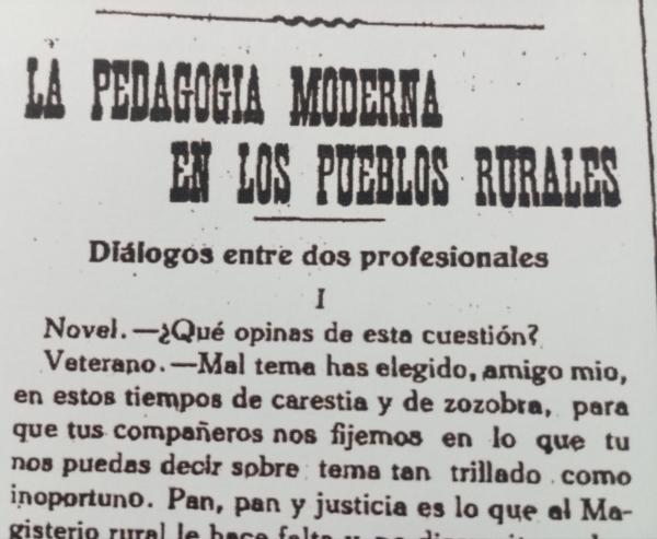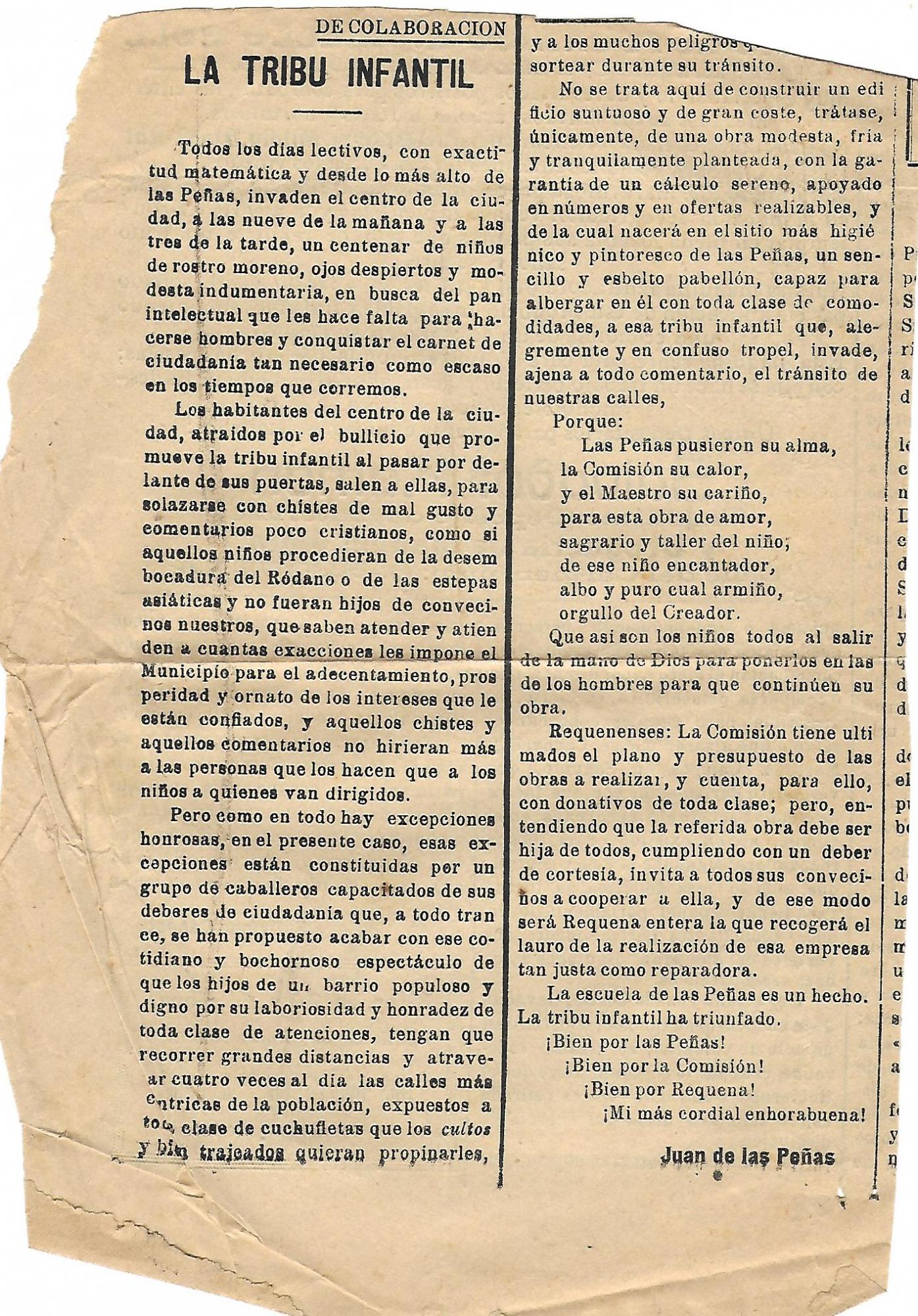En el artículo de Emilio Zorita que se propone como documento del mes y que está escrito en el periódico local La voz de Requena bajo el pseudónimo de «Juan de las Peñas», lamentó que los niños de Las Peñas tuvieran que desplazarse a pie hasta el centro de Requena para asistir a la escuela, dado que el barrio carecía de local para la enseñanza desde 1921. Por otro lado, celebró que un grupo de requenenses hubiera accedido a su proposición de acometer las obras de una nueva escuela en el barrio aportando jornales y donativos.
