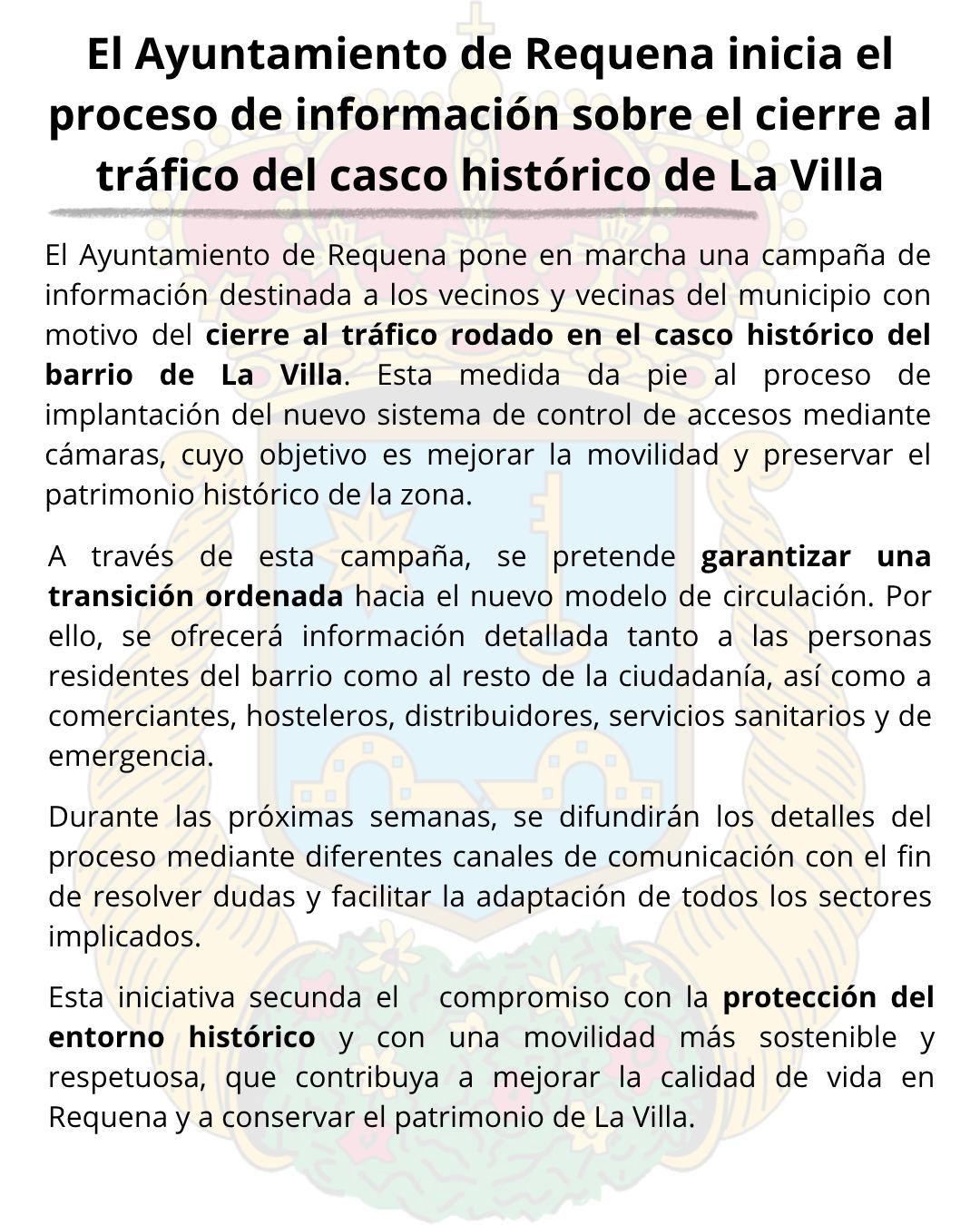 Desde el Ayuntamiento de Requena se inicia el proceso de información con motivo del cierre al tráfico rodado en el casco histórico del barrio de La Villa.