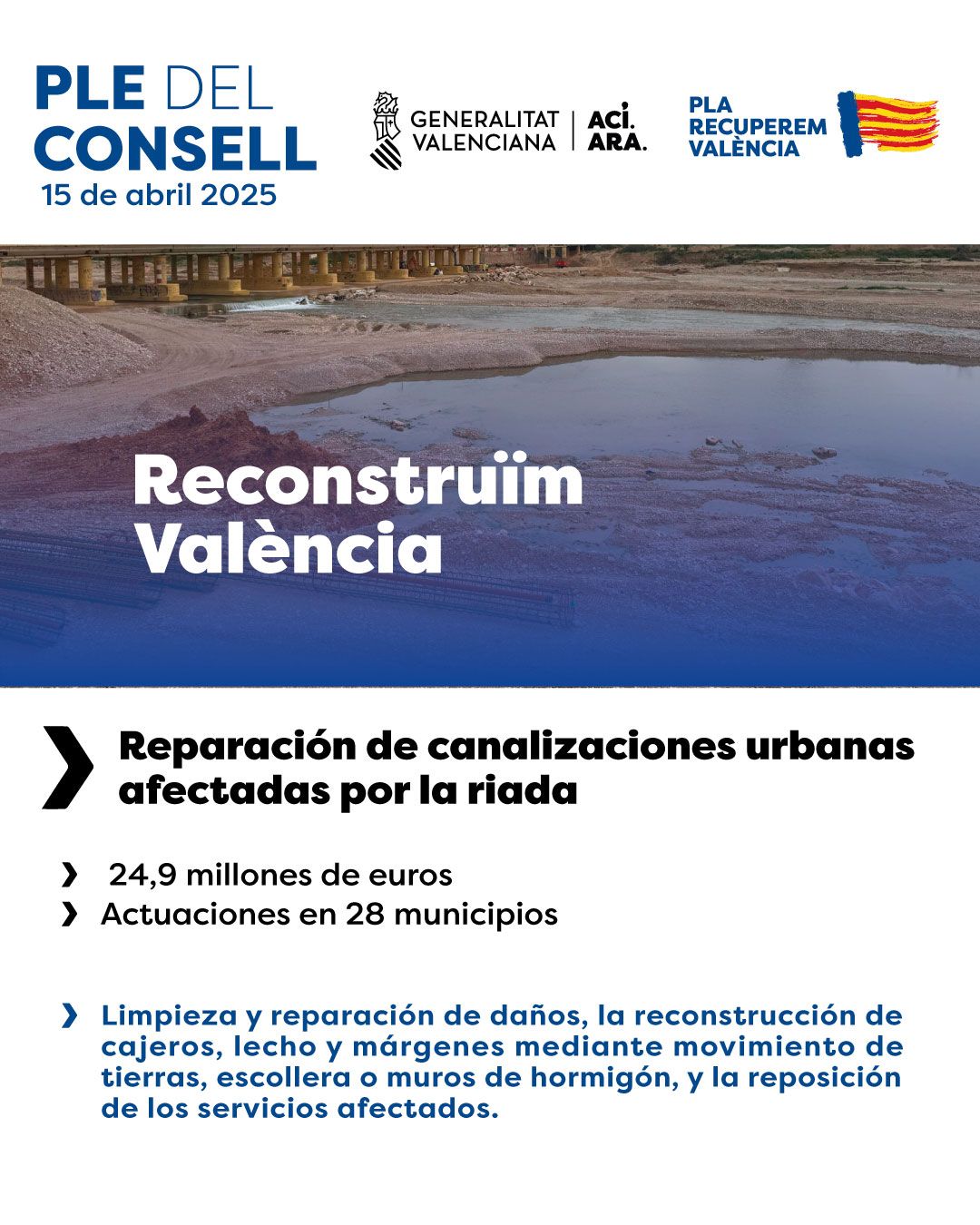 El Consell ha ratificado la declaración de emergencia por parte de la Conselleria de Agricultura, Agua, Ganadería y Pesca para la contratación de las obras y servicios de asistencia técnica de dirección de obra y seguridad y salud, para la reparación de los daños ocasionados por la dana en las canalizaciones urbanas de la provincia de Valencia.