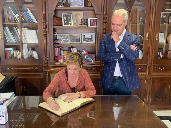 La visita ha comenzado en el Ayuntamiento, donde la consellera ha firmado en el libro de honor de la ciudad.