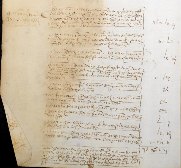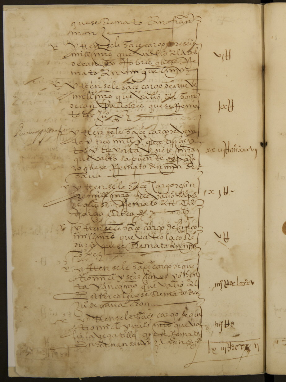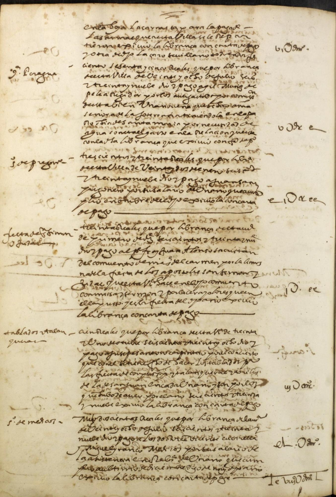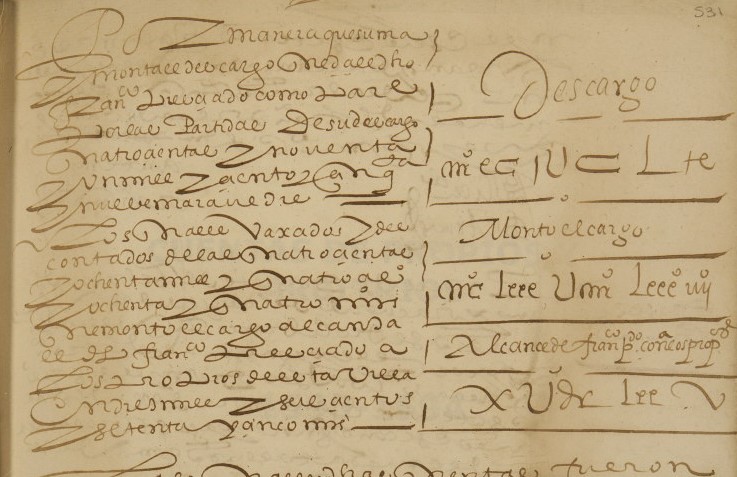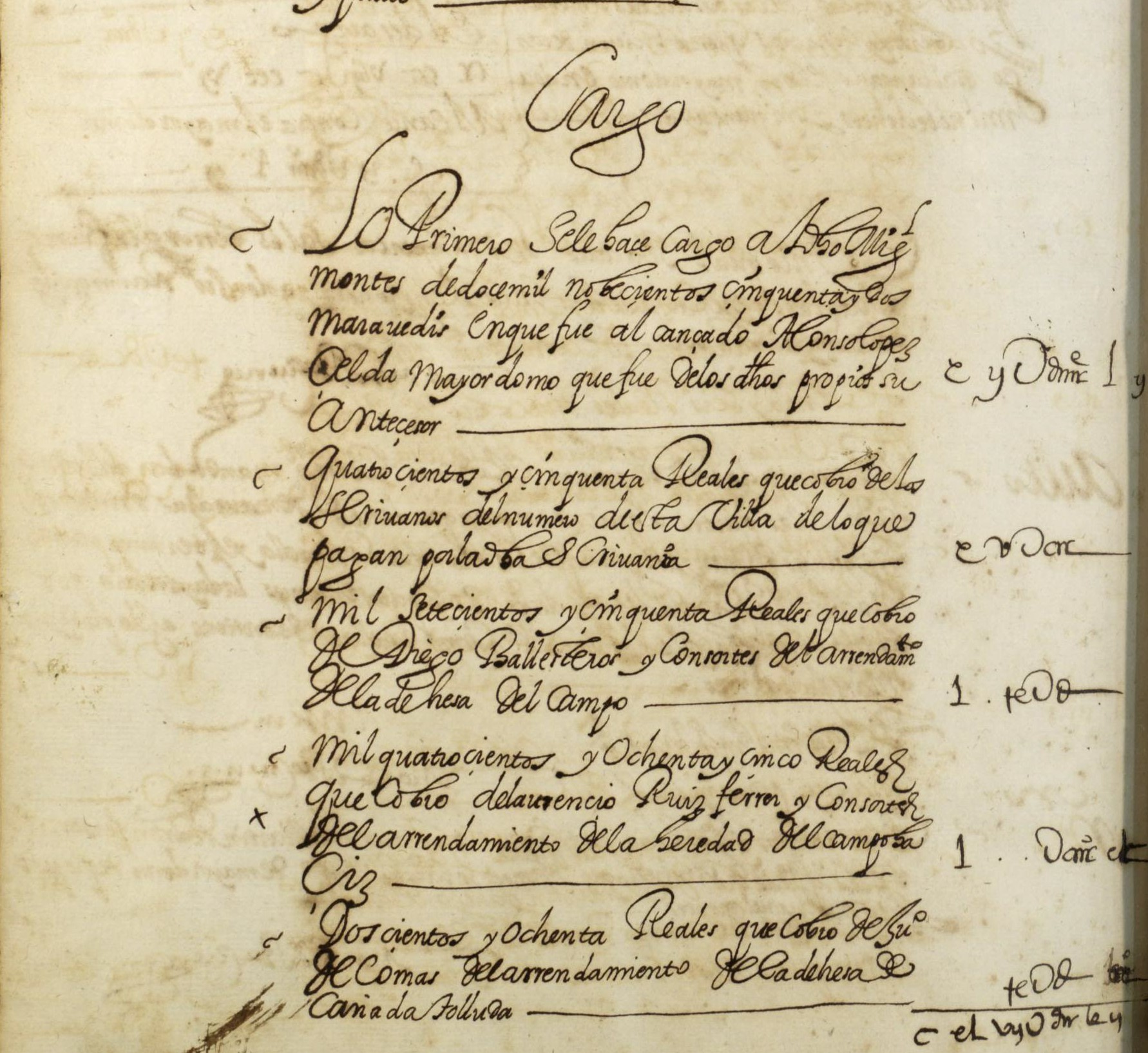 En estas últimas cuentas se suele emplear en letra el valor en reales, sin embargo, al margen derecho está expresado en maravedíes en números romanos. Un real equivalía a treinta y cuatro maravedíes.