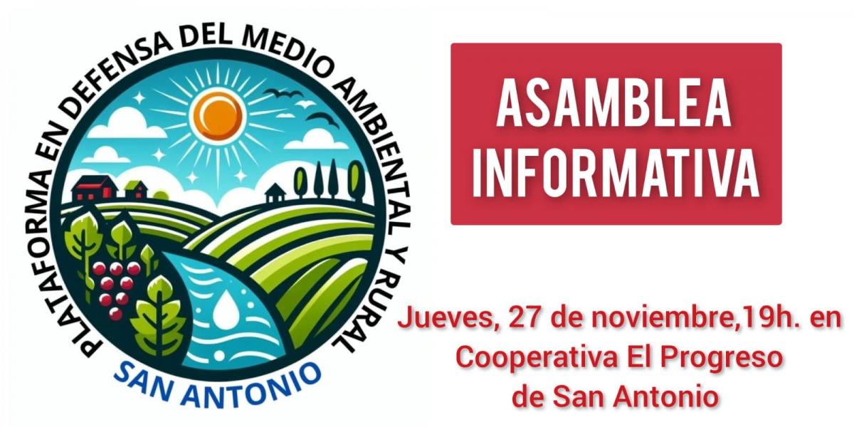 La Plataforma en Defensa del Medio Ambiental y Rural de San Antonio y Comarca convoca a toda la ciudadanía a una Asamblea Informativa que tendrá lugar el jueves ,27 de noviembre de 2025, a las 19:00 horas, en los Salones de la Cooperativa El Progreso (C/ Mayor, 20 – San Antonio de Requena).