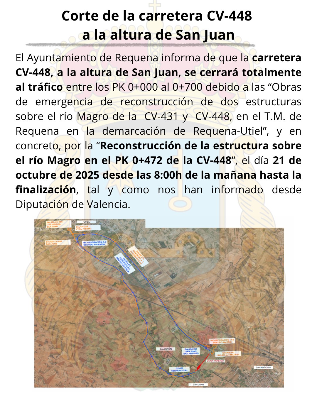Desde el Ayuntamiento de Requena informan de que la carretera CV-448, a la altura de San Juan, permanecerá cerrada al tráfico entre los puntos kilométricos 0+000 y 0+700 a partir de las 08:00h de mañana, martes 21 de octubre, debido a las obras de reconstrucción de la estructura sobre el río Magro.