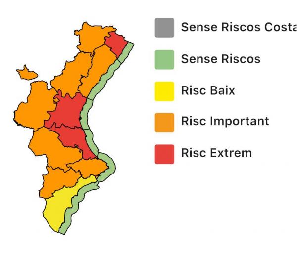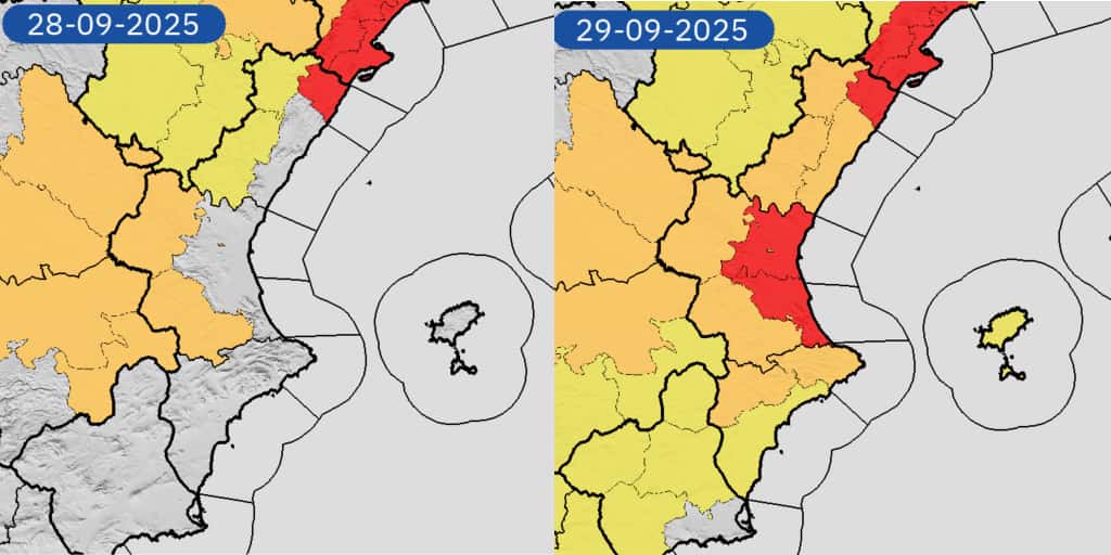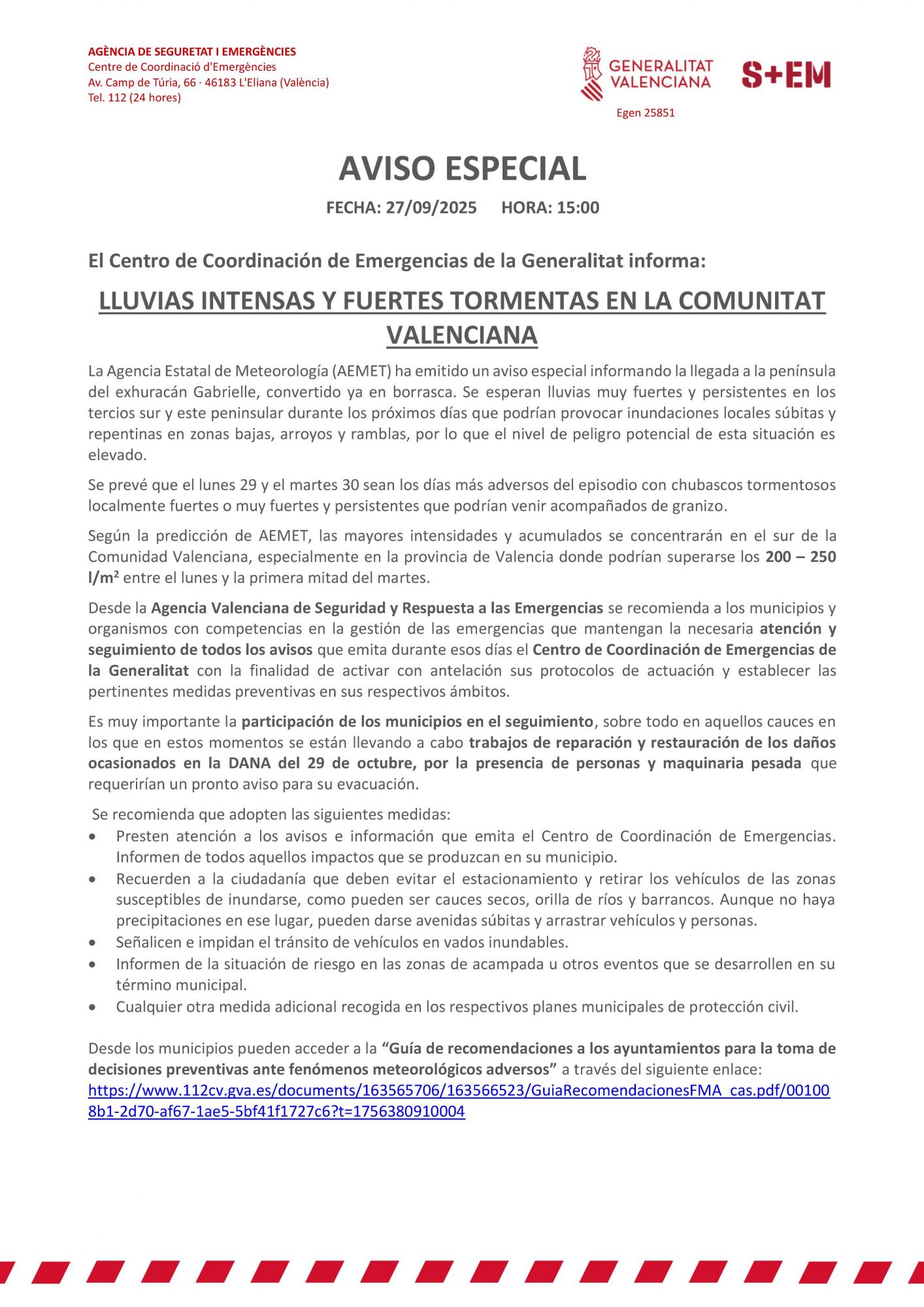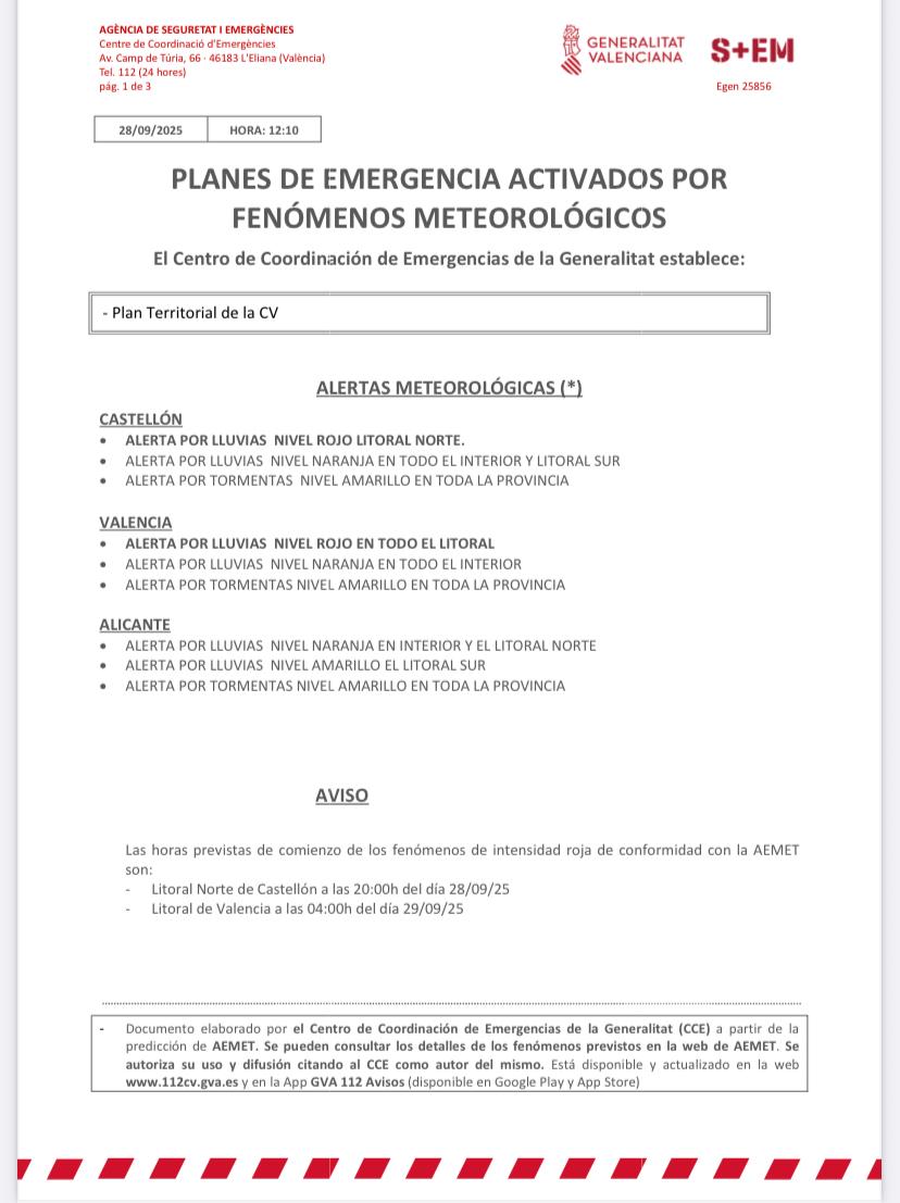 Para los días 28, 29 y 30 de septiembre se esperan precipitaciones de carácter excepcional en toda la Comunidad Valenciana, que podrían superar los 180 l/m2 en 12 horas, con intensidades en algunos momentos de tipo torrencial, sobre todo en las zonas litorales.