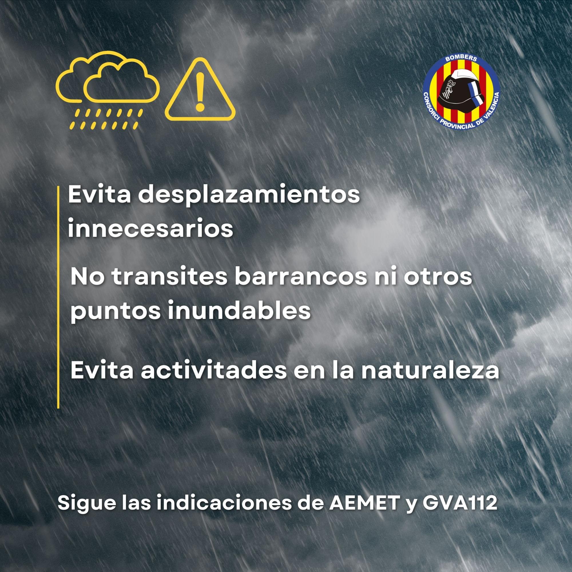 Las lluvias irán acompañadas de fenómenos tormentosos. Se recomienda que sigan la actualización de los avisos y durante el episodio eviten todo tipo de actividad que pueda implicar un riesgo para su seguridad. No se acerquen a ríos y barrancos. Se pueden producir inundaciones súbitas extremadamente peligrosas, y, en ningún caso, atraviesen badenes inundables o pasos inferiores que puedan estar afectados.