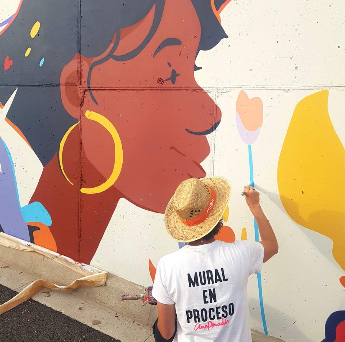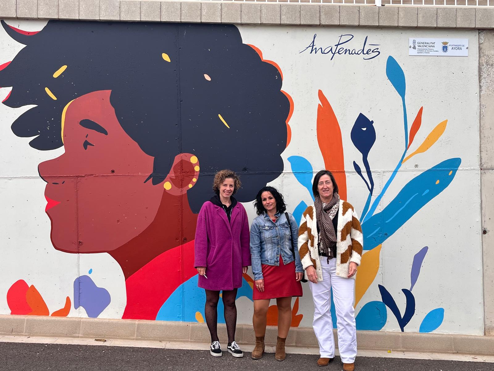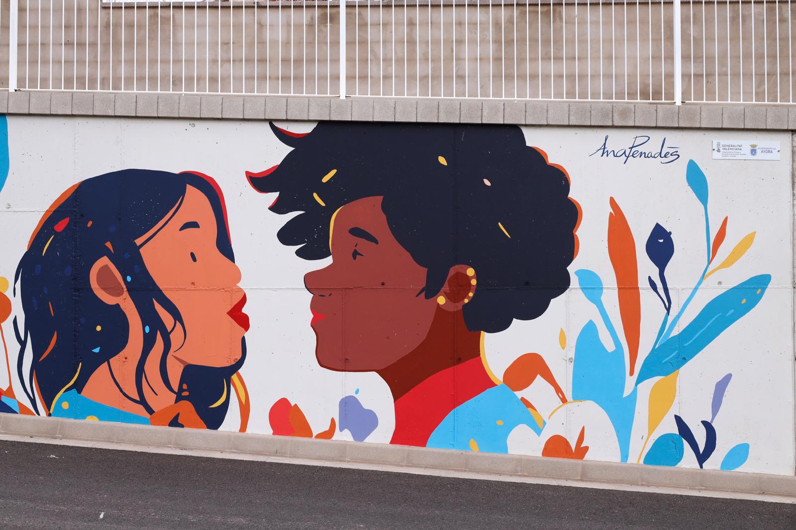 La muralista Ana Penadés ha vuelto a pintar en Ayora. La artista ha transformado un muro anodino en un espacio de diálogo, belleza, y respeto.