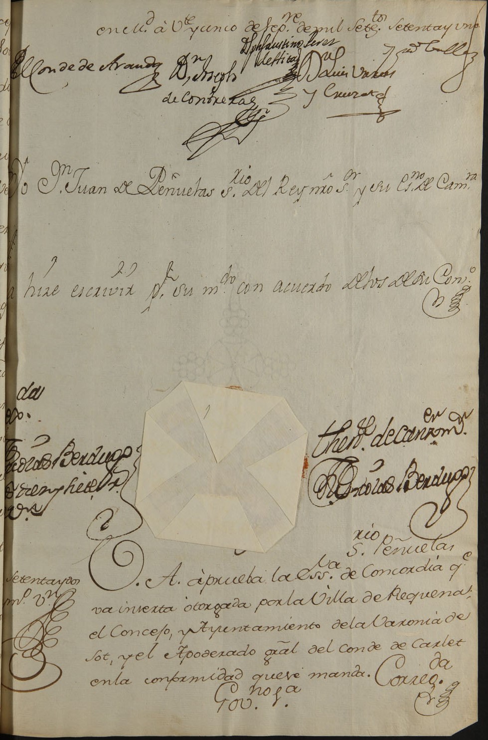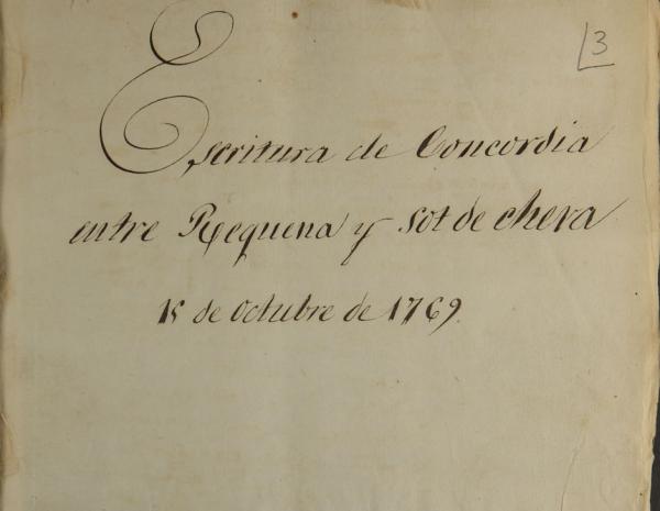 AMRQ 2911/3. 1769. Concordia entre Requena y la Baronía de Sot sobre amojonamiento y aprovechamientos comunes en la zona del Reatillo y Barranco Mardániz.
