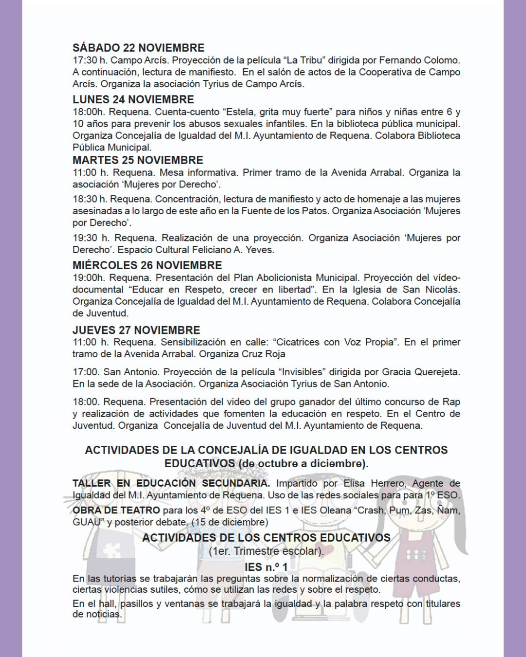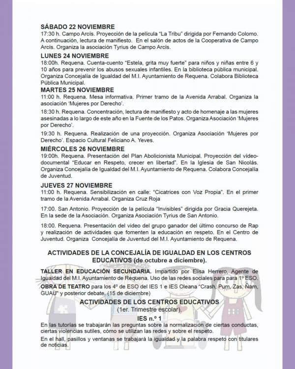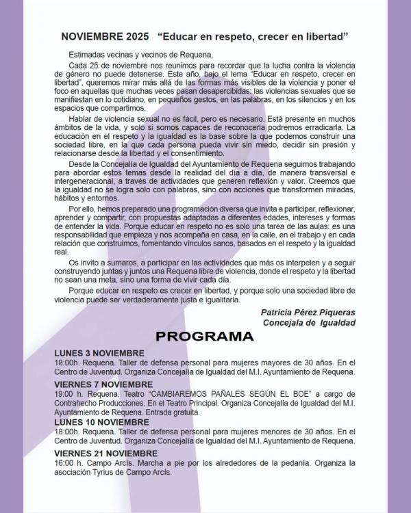Desde el Ayuntamiento de Requena nos presentan la programación con motivo del 25 de noviembre, Día Internacional para la Eliminación de la Violencia contra las Mujeres.