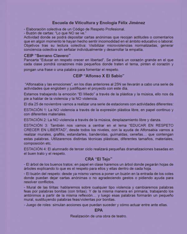 La programación incluye talleres de defensa personal , teatro , cine , actividades educativas , mesas informativas y actos conmemorativos , con propuestas pensadas para todas las edades. Un conjunto de acciones que invitan a reflexionar, aprender y construir relaciones más libres, sanas e igualitarias.