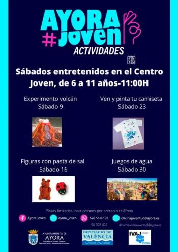 El departamento Ayora Joven, del Ayuntamiento de Ayora, prepara, para los sábados de julio, unas actividades que se desarrollarán en el Centro Joven de Ayora, a las 11:00 horas.