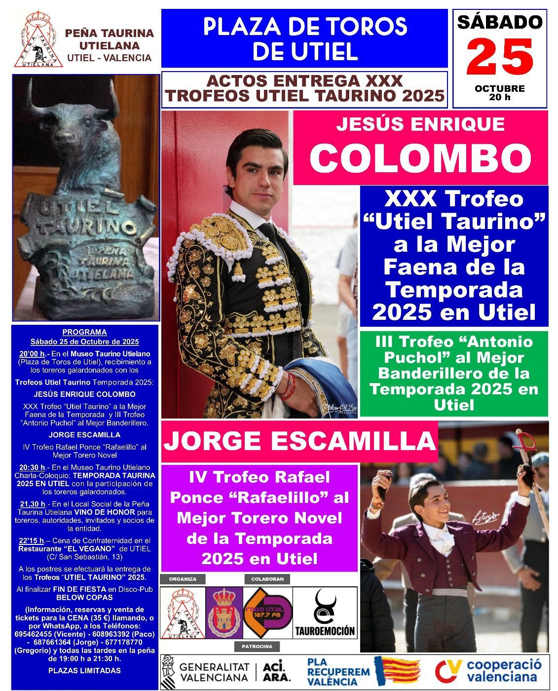 -JESUS ENRIQUE COLOMBO XXX: Trofeo «Utiel Taurino» a la Mejor Faena de la Temporada y III Trofeo «Antonio Puchol» al Mejor Banderillero.