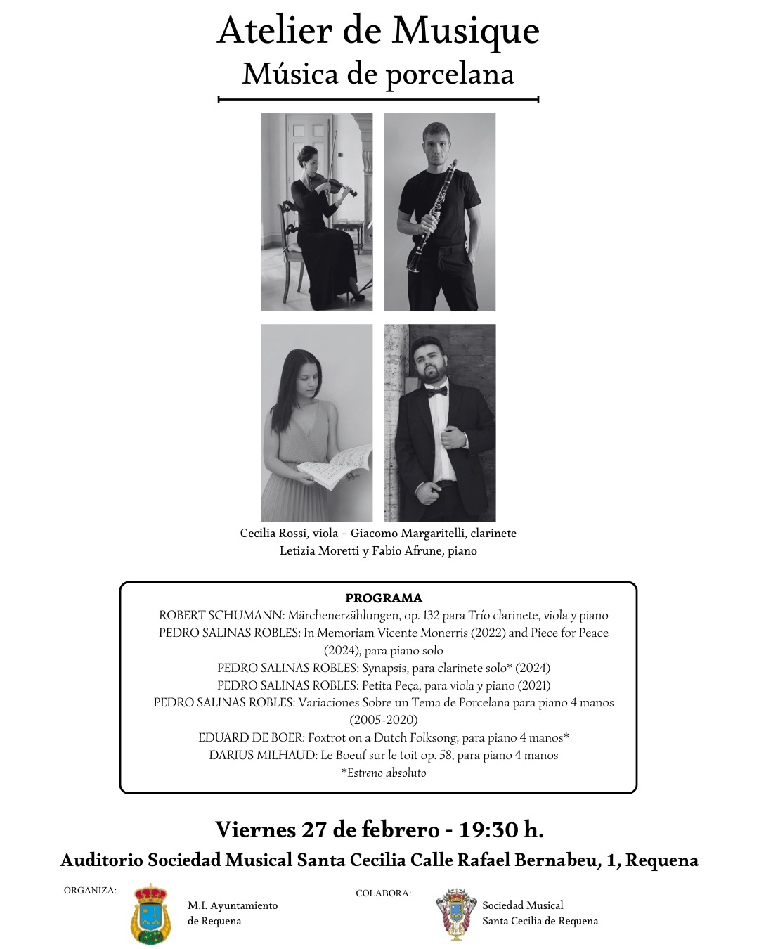 El cuarteto Atelier de Musique llega a Requena desde Italia con su Música de Porcelana, un programa que incluye obras de Robert Schumann, Darius Milhaud y estrenos absolutos de Eduard de Boer y el requenense Pedro Salinas Robles.