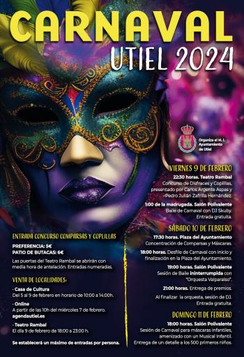 El sábado 10 de febrero, a partir de las 17.30 horas, Concentración y Desfile de Carnaval con inicio y fin del recorrido en la Plaza del Ayuntamiento de Utiel. Al finalizar, sesión de baile ininterrumpida con orquesta Valparaíso en el Salón Polivalente y a las 21.00 horas entrega de premios, que este año cuentan con una mayor dotación económica.