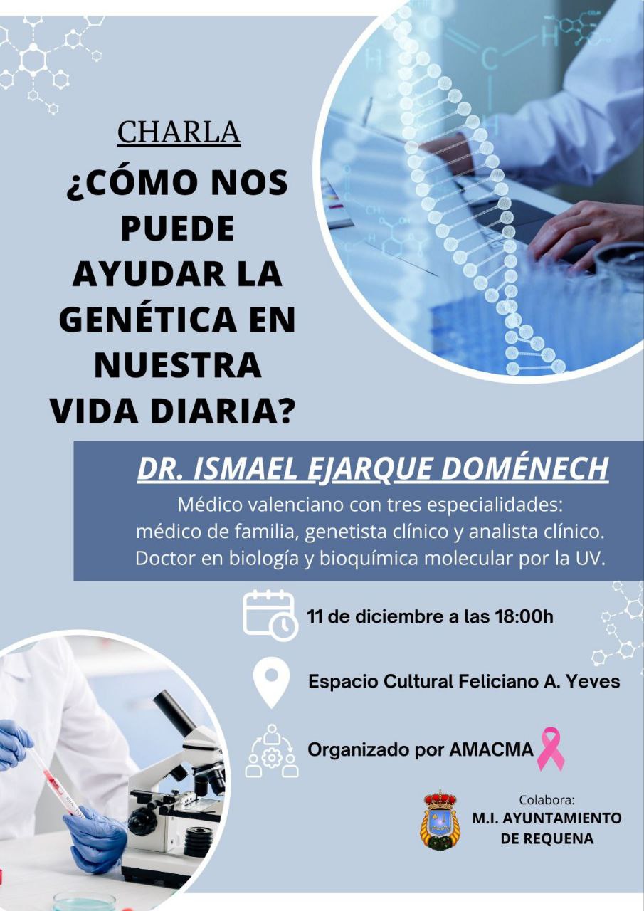 El lunes 11 de diciembre a las 18:00 h, el Dr. Ismael Ejarque Doménech llevará a cabo una sesión de divulgación científica en el Espacio Cultural Feliciano A. Yeves (Requena) que lleva por título: «¿Cómo nos puede ayudar la genética en nuestra vida diaria?«.