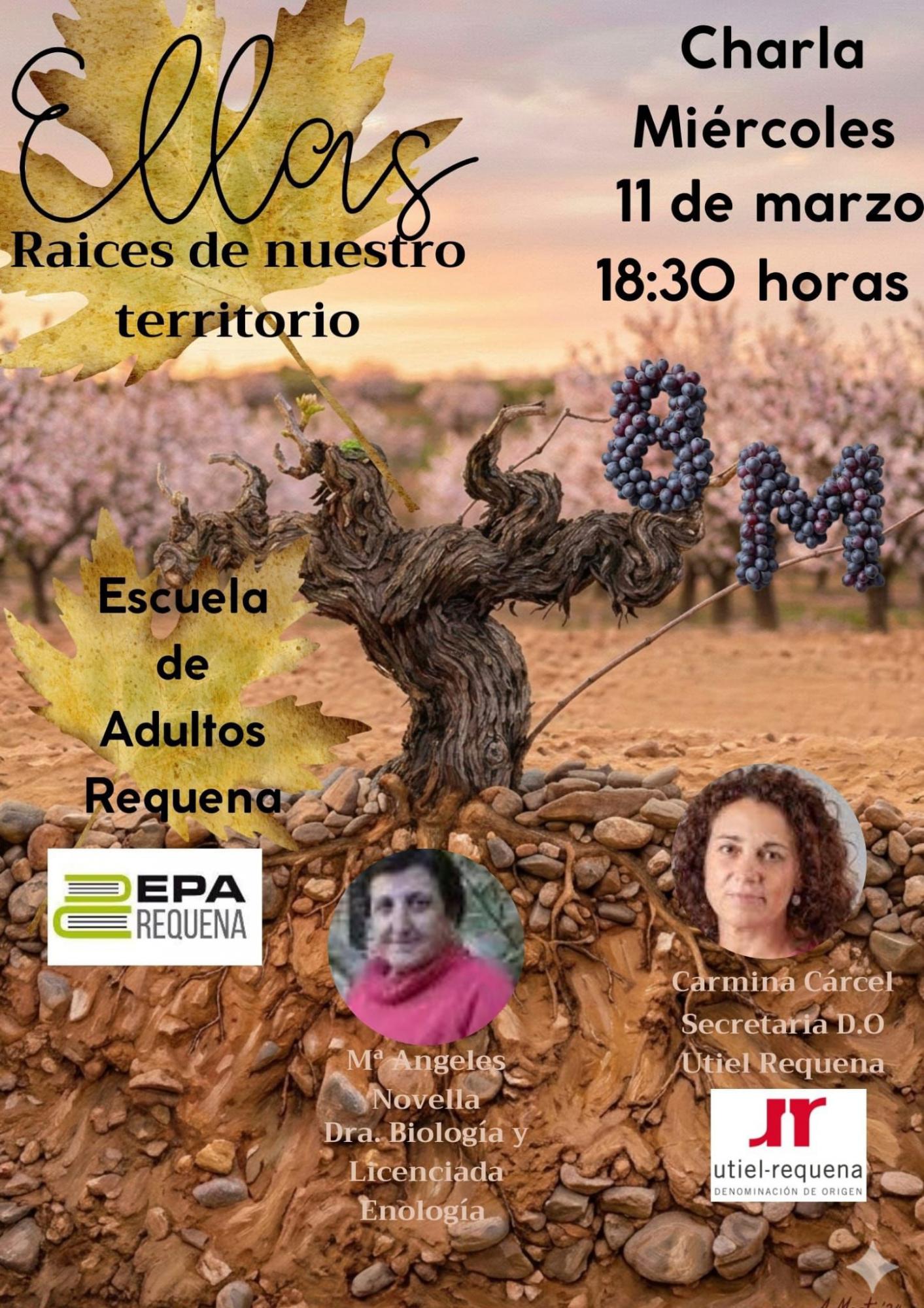 El próximo miércoles, 11 de marzo, a las 18.30 horas, tendrá lugar en el Centro de Formación de Personas Adultas Antigua Escuela Zorita una charla coloquio con el título “Ellas, raíces de nuestro territorio”. Participarán Carmina Cárcel, secretaria del Consejo Regulador de la Denominación de Origen Utiel-Requena y Mª Ángeles Novella, enóloga y Doctora en Biología, para compartir con el alumnado su experiencia y su trayectoria profesional como mujeres agricultoras, en el marco de las celebraciones por el 8M de este 2026, que ha sido declarado por la Asamblea General de las Naciones Unidas como el Año Internacional de la Agricultora para acelerar la igualdad de género y el empoderamiento de las mujeres en todos los eslabones de la cadena agroalimentaria.