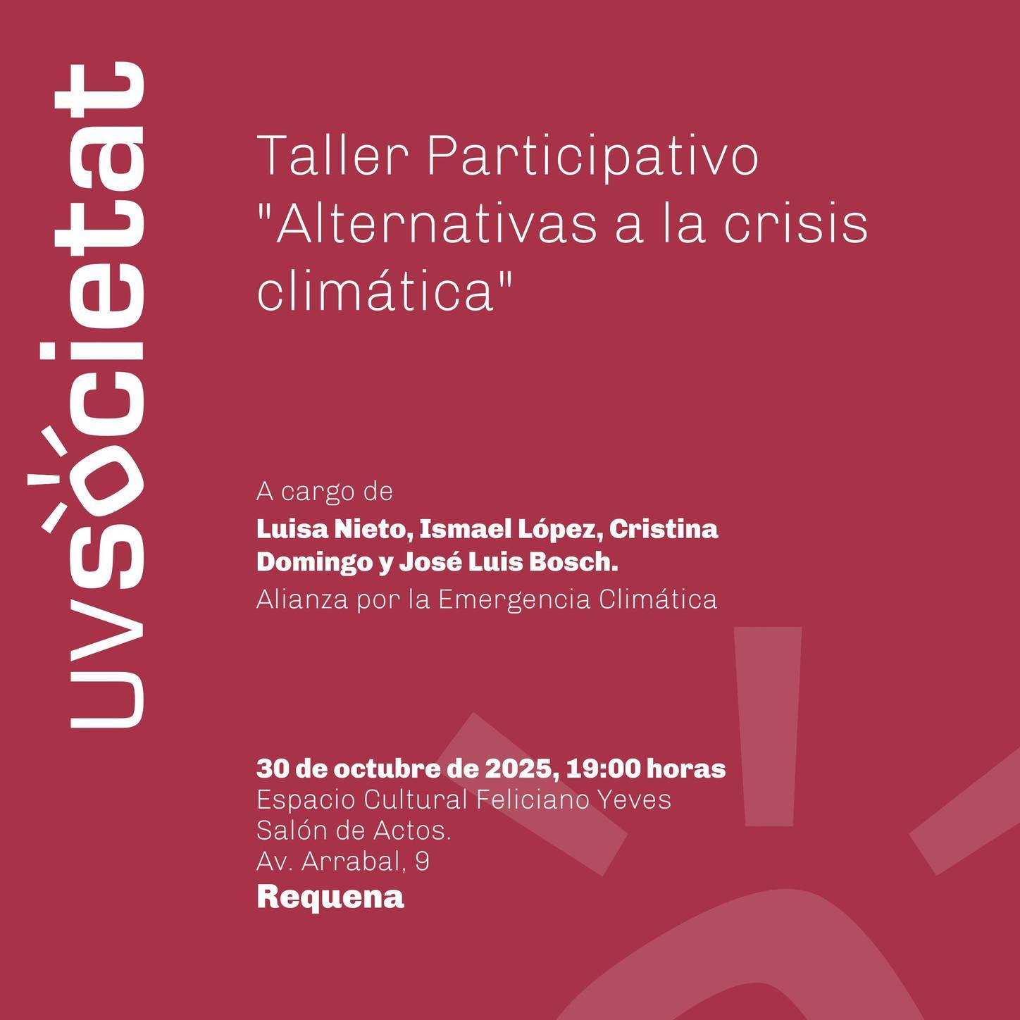 El próximo jueves, 30 de octubre de 2025, a las 19 horas y en el Salón de Actos del Espacio Cultural Feliciano Antonio Yeves de Requena se inicia el ciclo de charlas de Unisocietat Requena 2025/2026 con un interesante taller sobre «Alternativas a la crisis climática» a cargo de Luisa Nieto, Ismael López, Cristina Domingo y José Luis Bosch de Alianza por la Emergencia Climática. El ciclo de conferencias Unisocietat Requena está organizado por el M.I. Ayuntamiento de Requena y la Universitat de València con la colaboración de Caixa Popular y la Diputación Provincial de Valencia. La asistencia es libre y gratuita.
