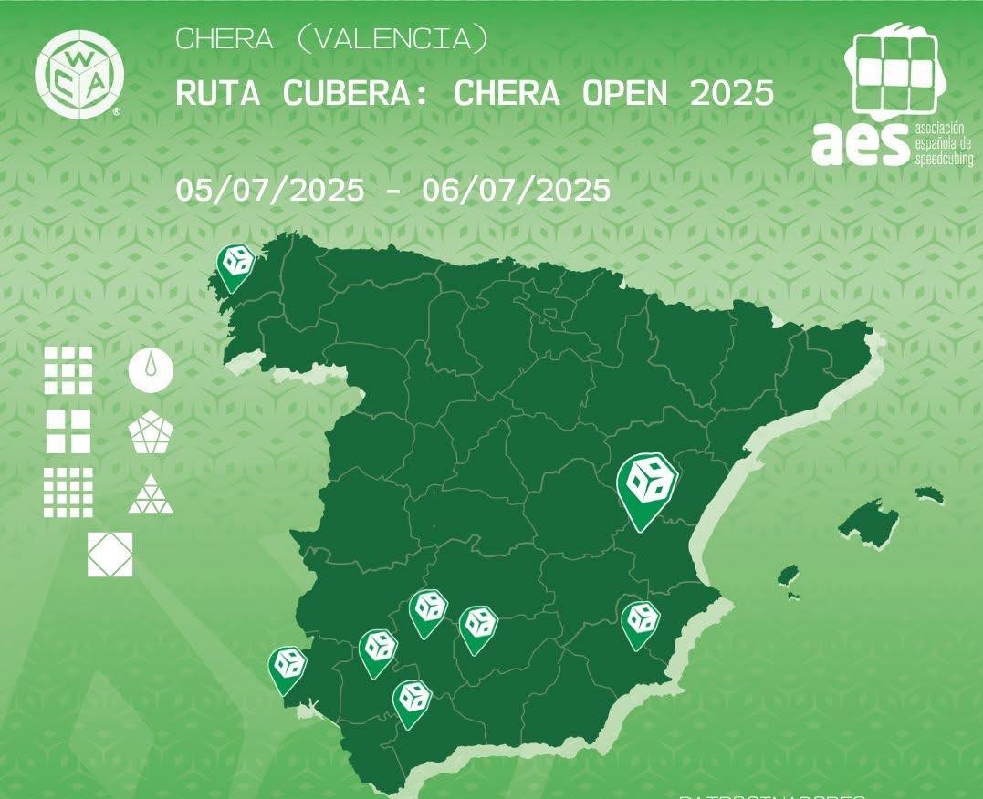 Este fin de semana el local de la Eléctrica de Chera acoge Ruta Cubera: Chera Open 2025, una competición con cubos de Rubik que contará con las siguientes categorías: 3x3x3, 2x2x2, 4x4x4, Clock, Megaminx, Pyraminx, Skewb.
