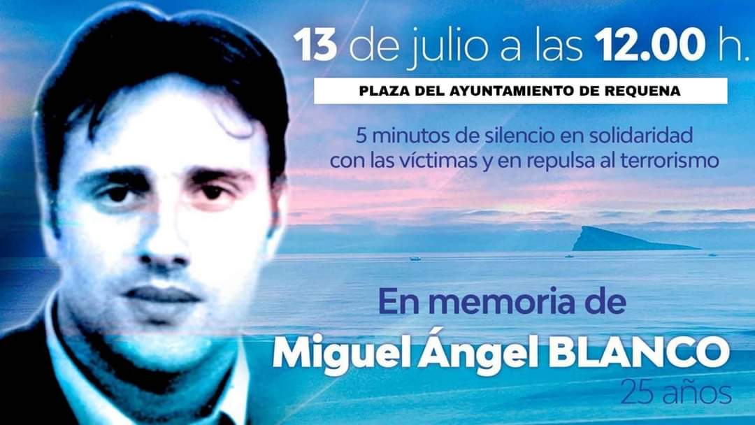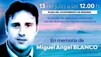 Con motivo del 25 aniversario del asesinato del Concejal de Ermua, Miguel Ángel Blanco, el Ayuntamiento de Requena se suma a la invitación de la FEMP y convoca a concentrarse ante el Ayuntamiento mañana miércoles, 13 de julio, a las 12:00 horas, y guardar cinco minutos de silencio como muestra de solidaridad con todas las víctimas y en repulsa de cualquier clase de acto terrorista.