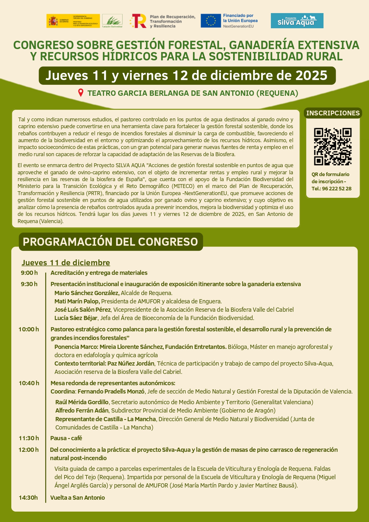 El congreso profundizará en el valor de la ganadería extensiva en la gestión forestal sostenible: prevención de incendios, conservación del paisaje, dinamización rural y mejora del territorio. También se presentarán experiencias piloto y buenas prácticas desarrolladas dentro del proyecto.