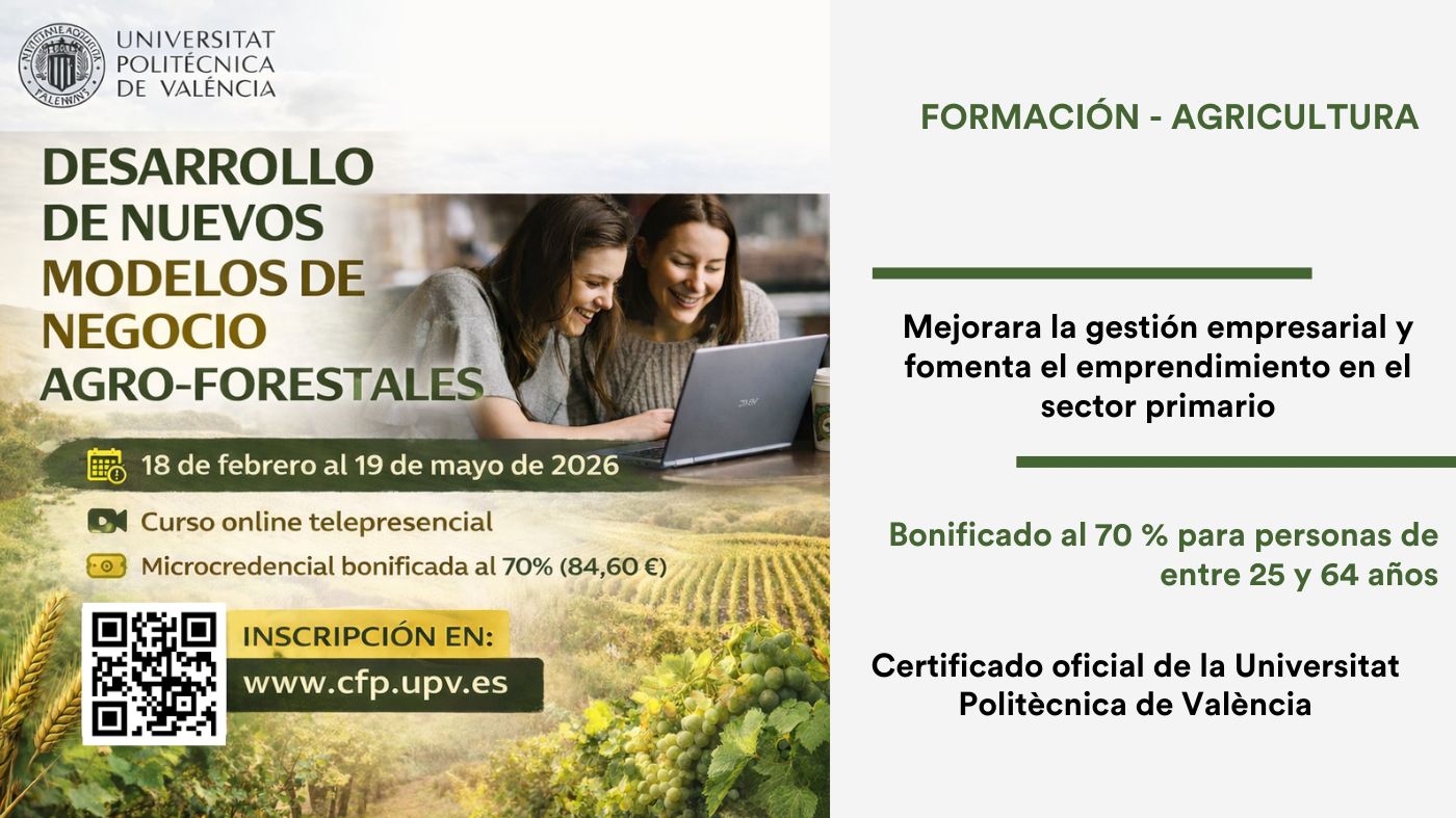 26 de enero de 2026 | La Mancomunidad del Interior Tierra del Vino se hace eco a través del Programa de Empleo y Formación Adapt@+t, de la primera edición del curso online “Desarrollo de nuevos modelos de negocio agro-forestales”, impulsado por la Universitat Politècnica de València (UPV), por considerarlo de especial interés para el tejido productivo y empresarial de nuestra comarca.